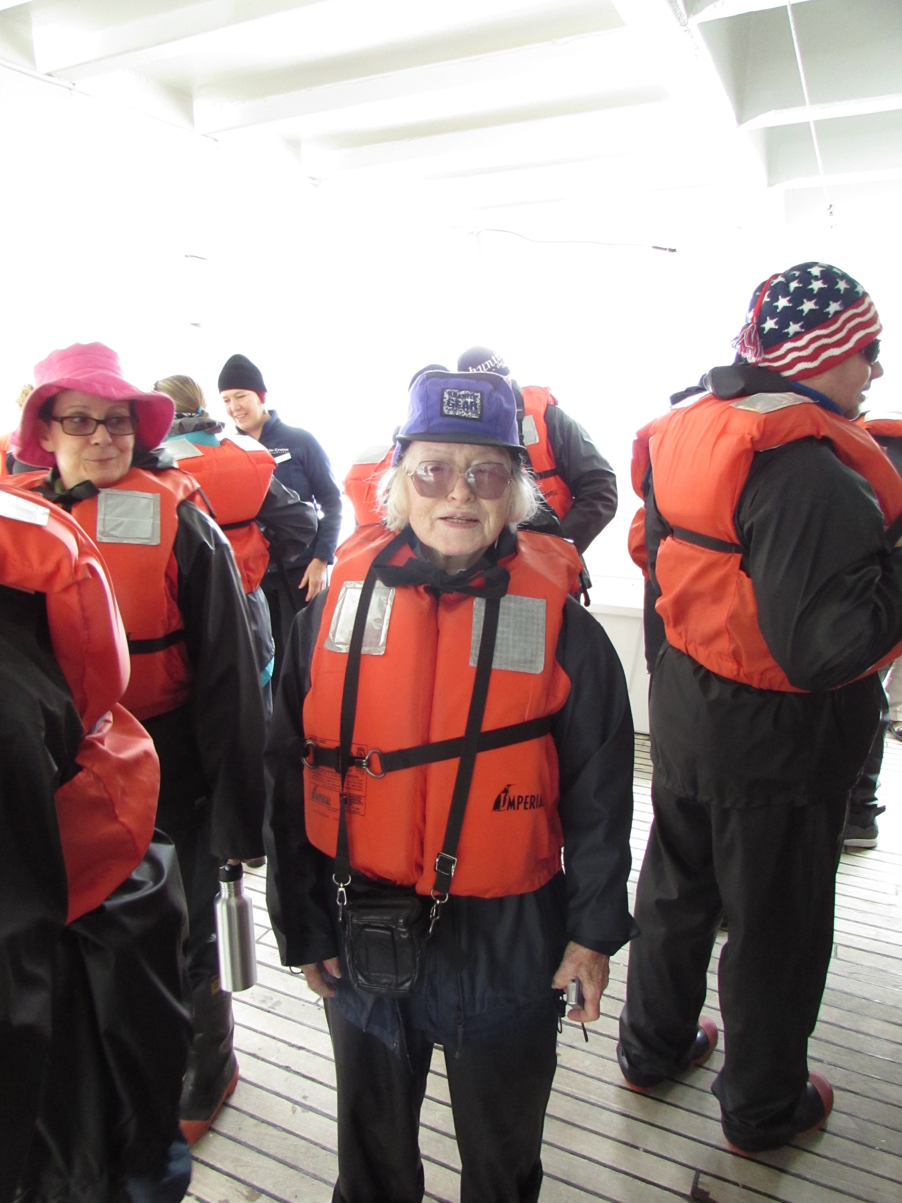 There were about 12 of us in the zodiac, all dressed in the suggested layers. I had on my long underwear, a long sleeved T-shirt, a cardigan, a windbreaker, and then the added cruise-provided black rubber windbreaker and pants, my hot pink hat and a pair of socks that I was glad I had brought to keep my hands warm.
