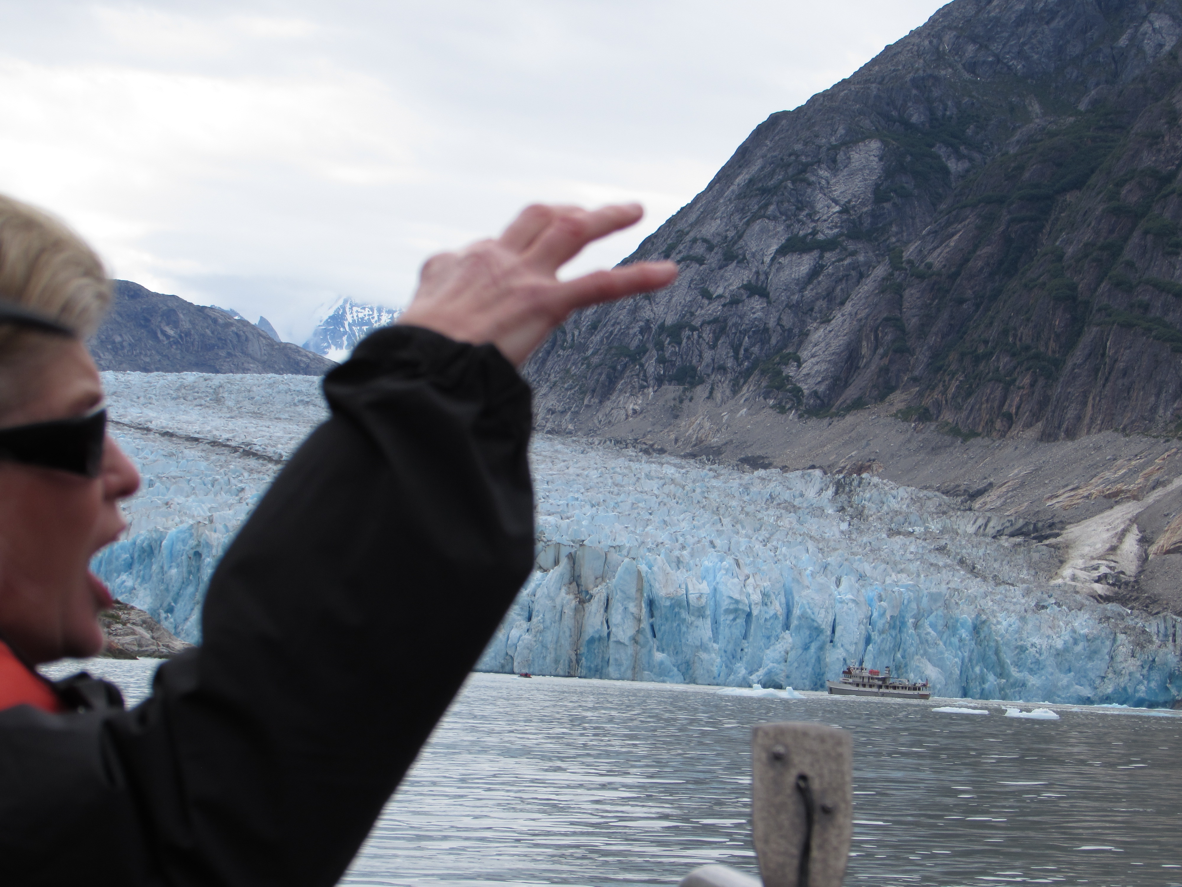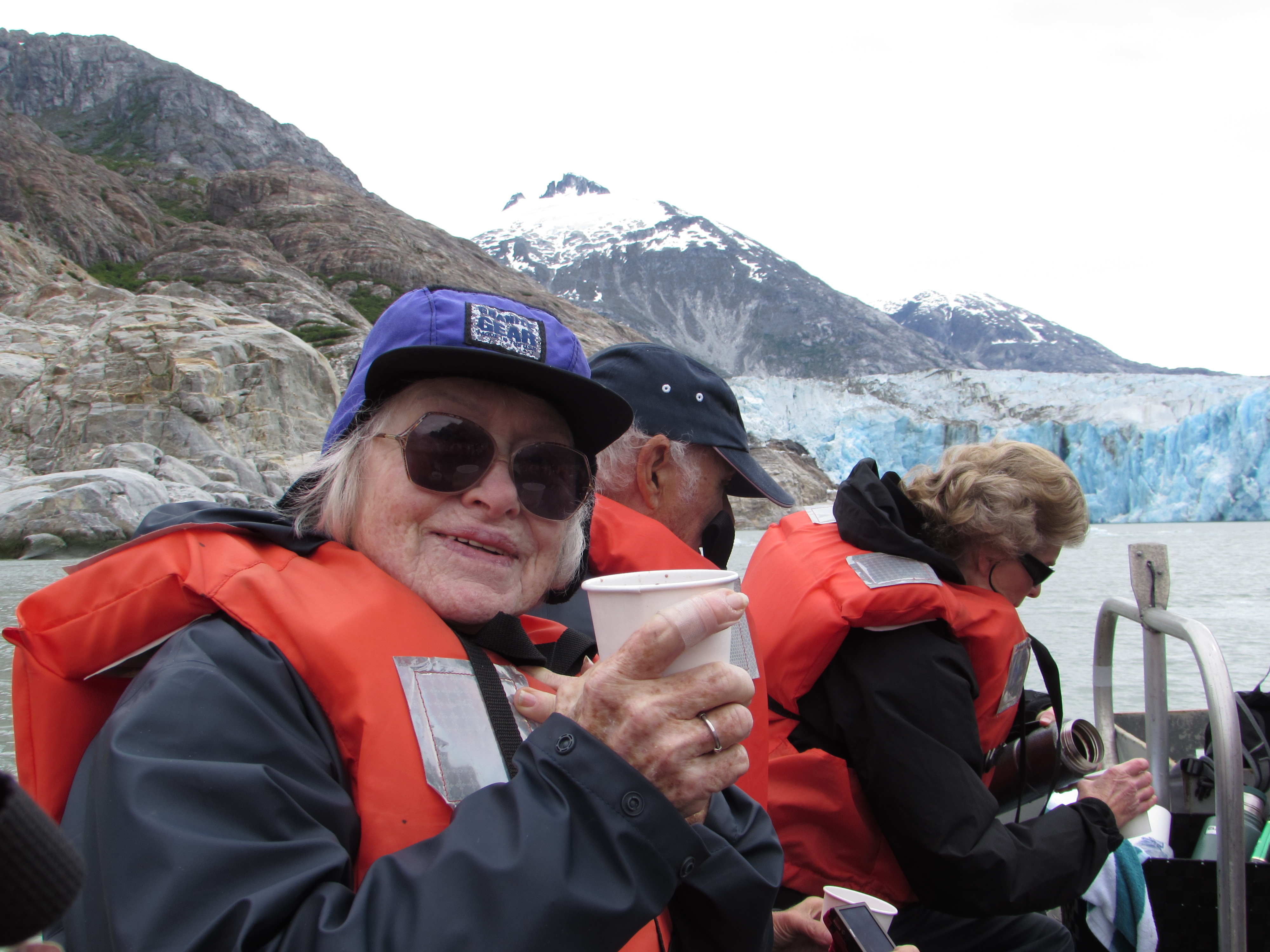 Of course it got much colder as we got closer to the glacier, and after parking to observe the glacier from this closer vantage point, Jackie cheerfully said, “who wants some hot chocolate?” I thought she was joking, but no, unbelievably, she passed out white paper cups and she handed around a bottle of peppermint schnapps followed by the steamy cocoa fom her green thermos. What a great idea it was, and so restorative. There is no misery associated with this cruise.