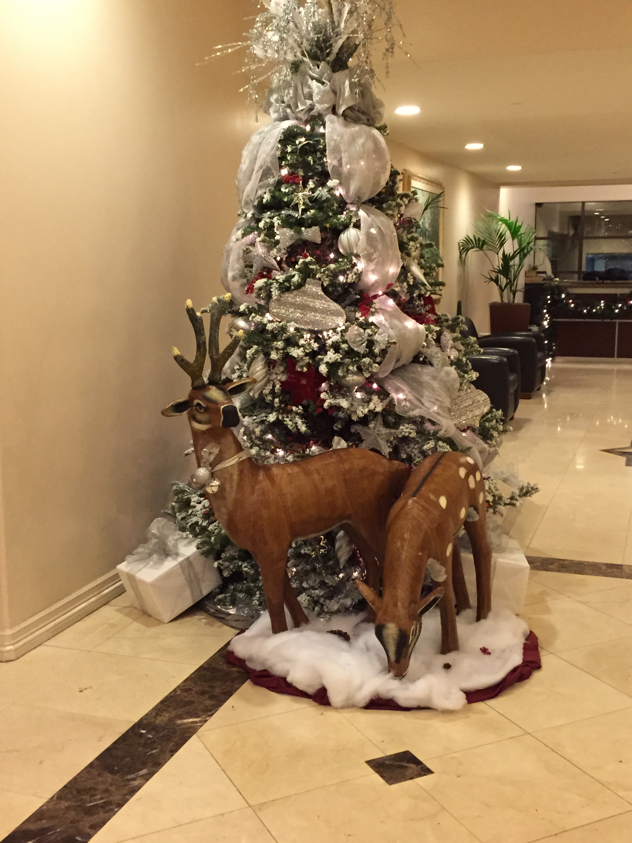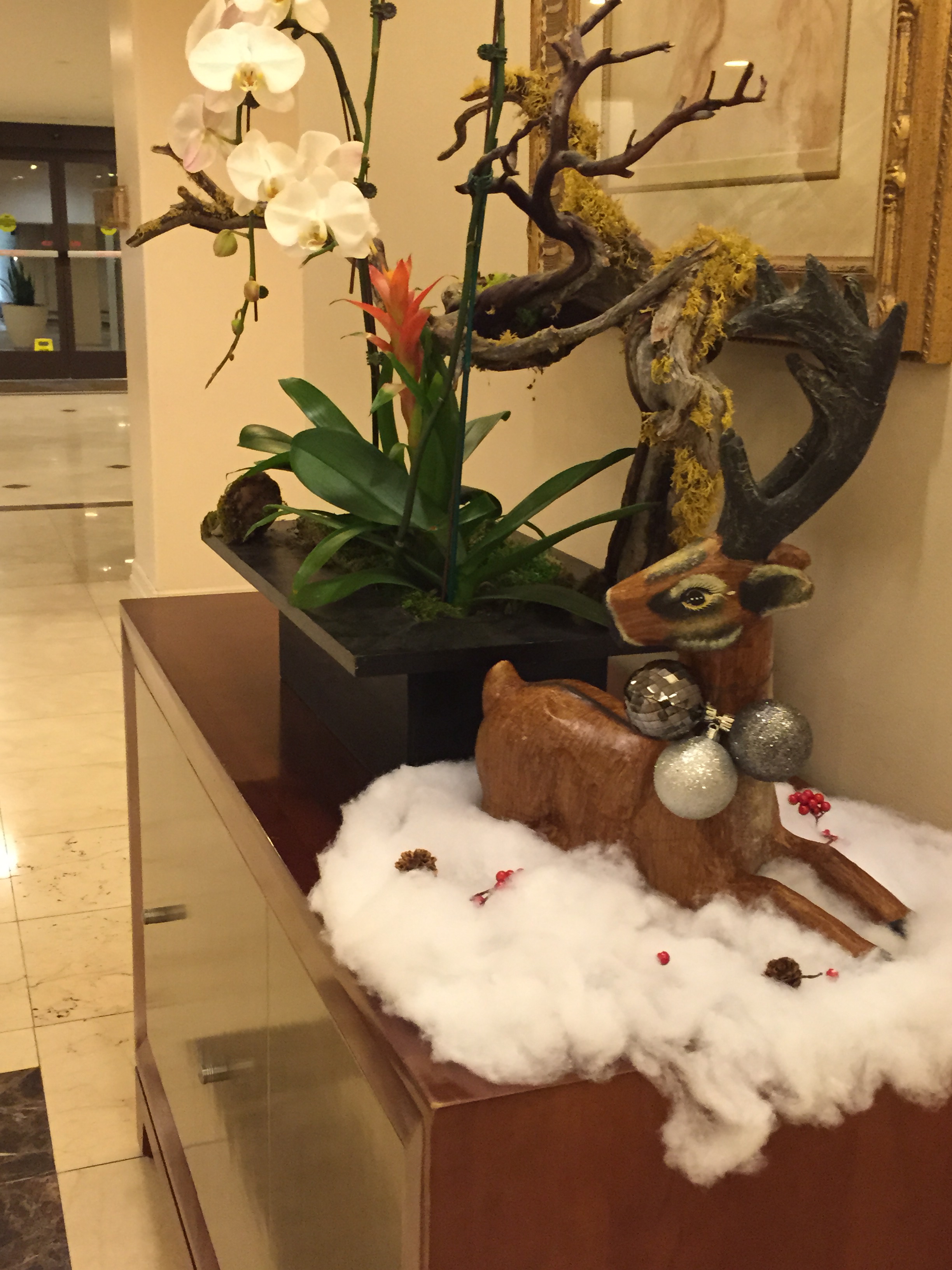 I took copious photographs of the two parental cervidae and noted that the juvenile was cruelly separated from his/her parents by the width of our cool white marbled lobby.