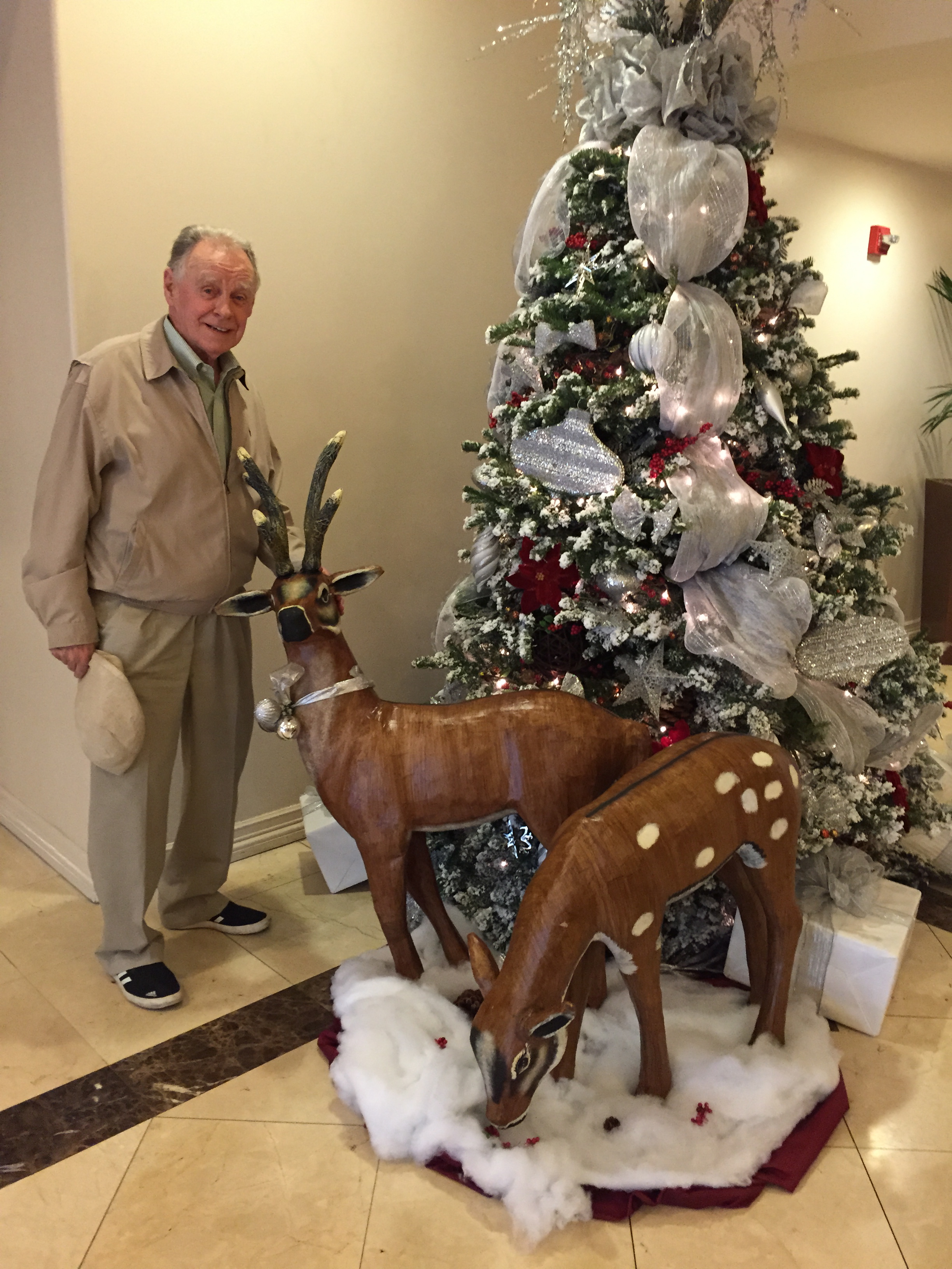 Whatever possessed him to request that his distinguished and 88-year-old actor father mount one of these cervine critters was pure folly. Besides, it was still not established whether these were inflatables or wooden. Either way, it would endanger both parties, the deer and my adorable husband. So I did the next best thing which was to ask him to climb into the display and stand next to the deer. Which he did. Evidence will show that the reunification project happened after this photo was taken. I know my gentle readers will forgive this lapse in chronology. Furthermore, that I posted the photo on Instagram, just so I could beat Chris.