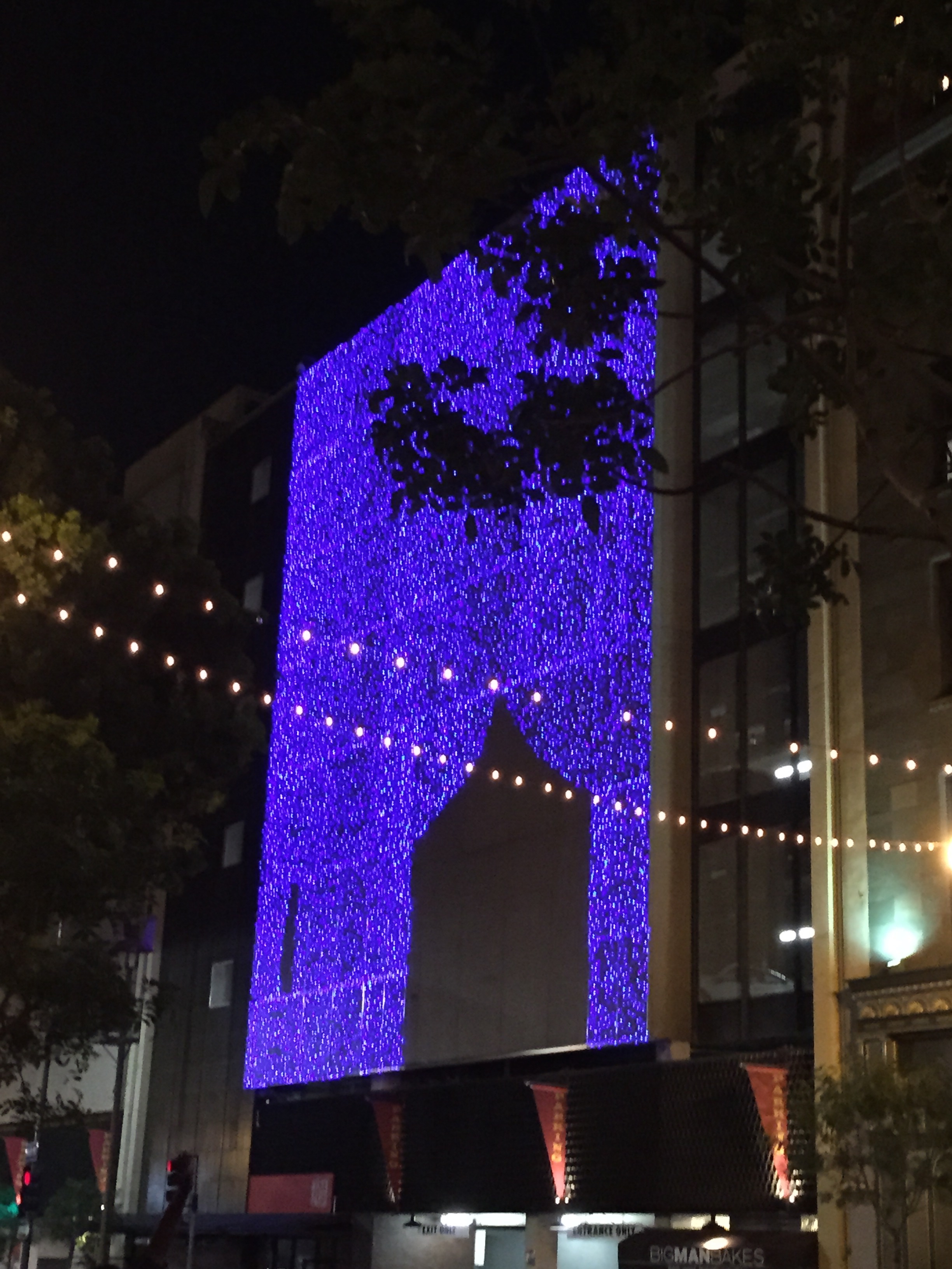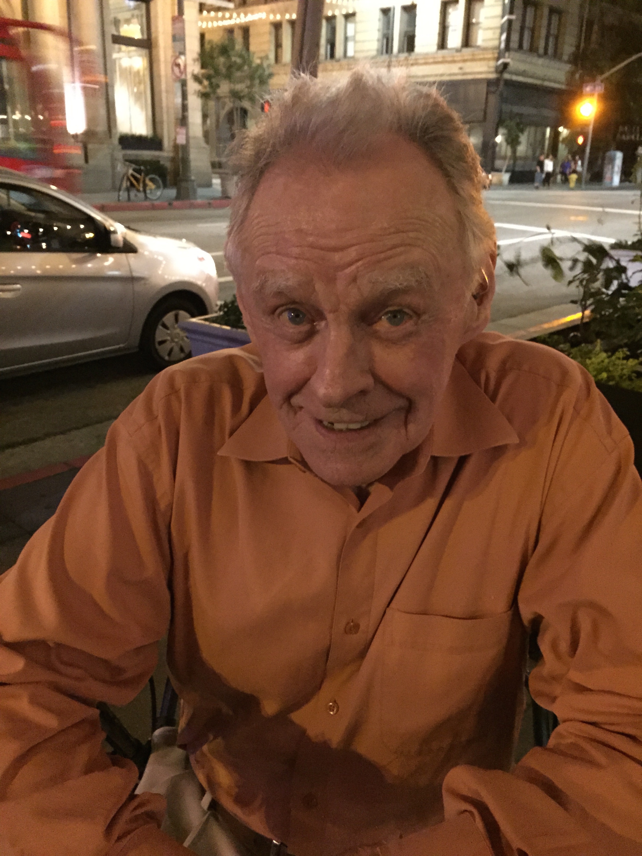 My darling husband as we waited for our car, the lit intersection of 4th and Main behind him.