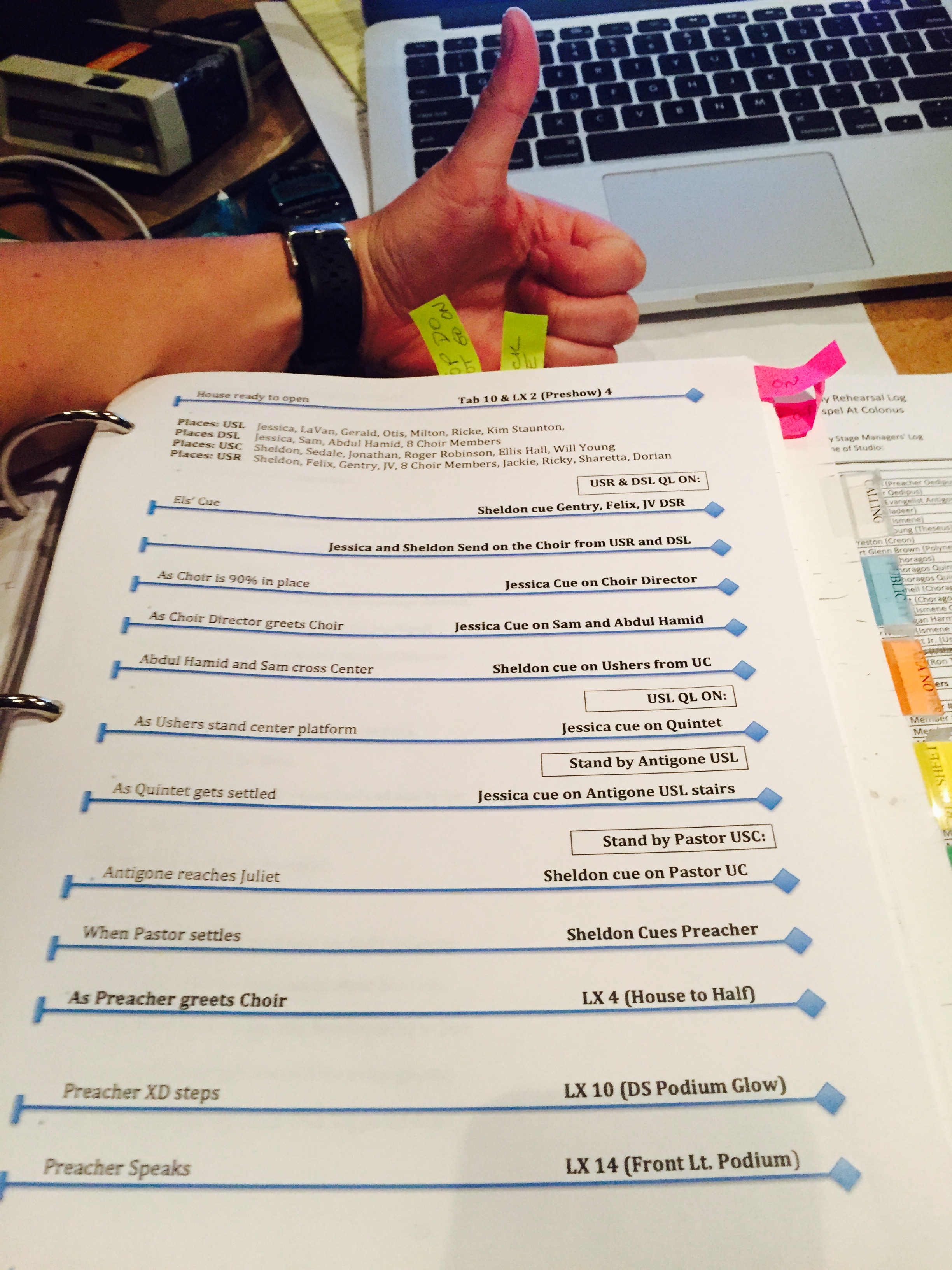 Top of Show cues for The Gospel At Colonus. Co-author Jessica Major’s thumb.