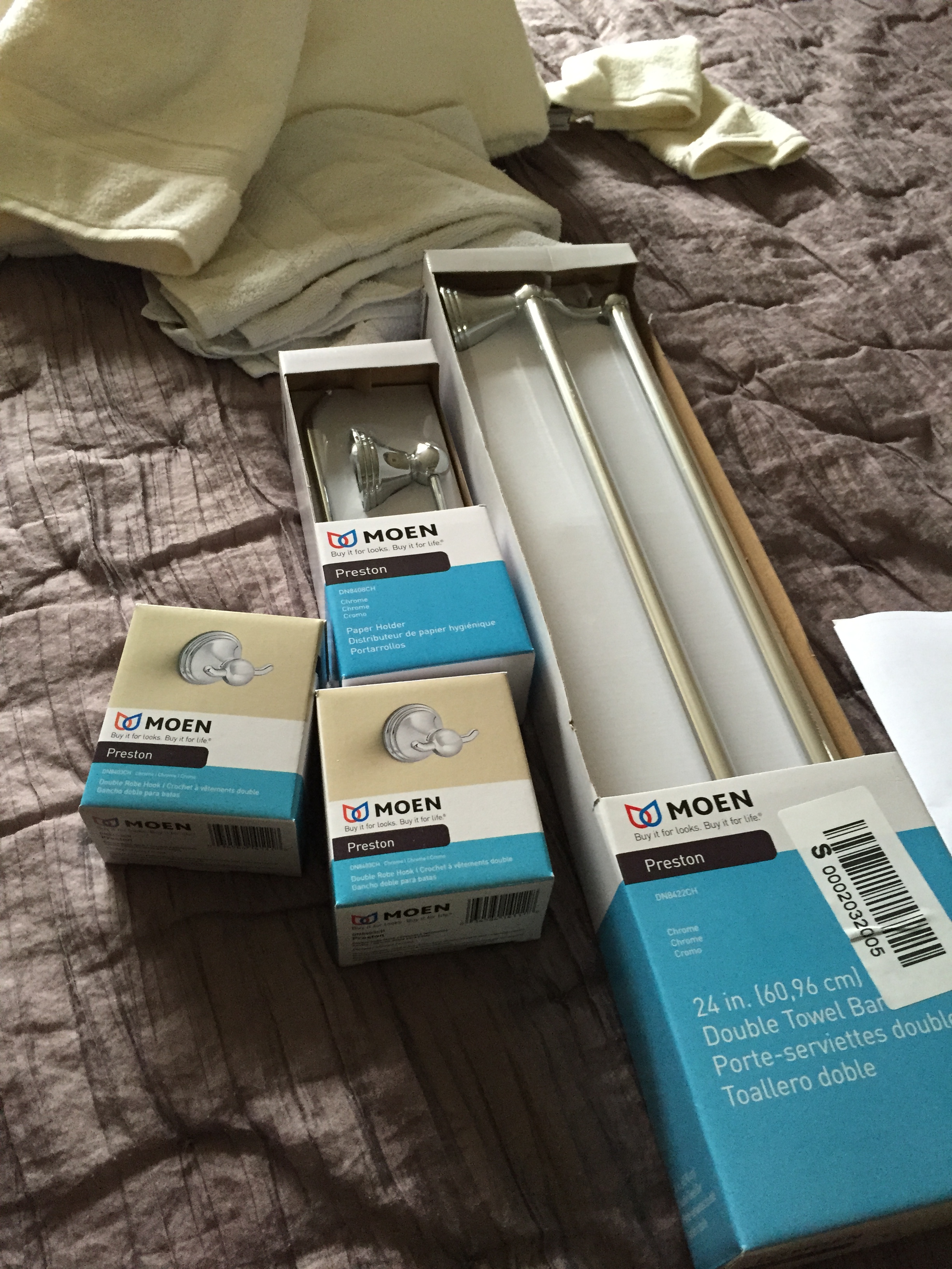 When I ordered the parts, I knew the size of the tub, and not being a plumber, didn’t know that those other parts weren’t just off the shelf parts at Home Despot. The fixtures were so reasonable – $129.00 for heavy-duty chrome shower head, shower controls and tub faucet. That was until I had to spend $258.00 for the valve to be express-shipped. Crap. And the drain, similarly had to be sent express so as not to stall the project. The drain stem arrived on Friday, allowing the work that needed to be done to get finished before the weekend. The medicine cabinet, towel bars and robe hooks arrived on Friday and are sitting quietly awaiting their turns to enter the space.