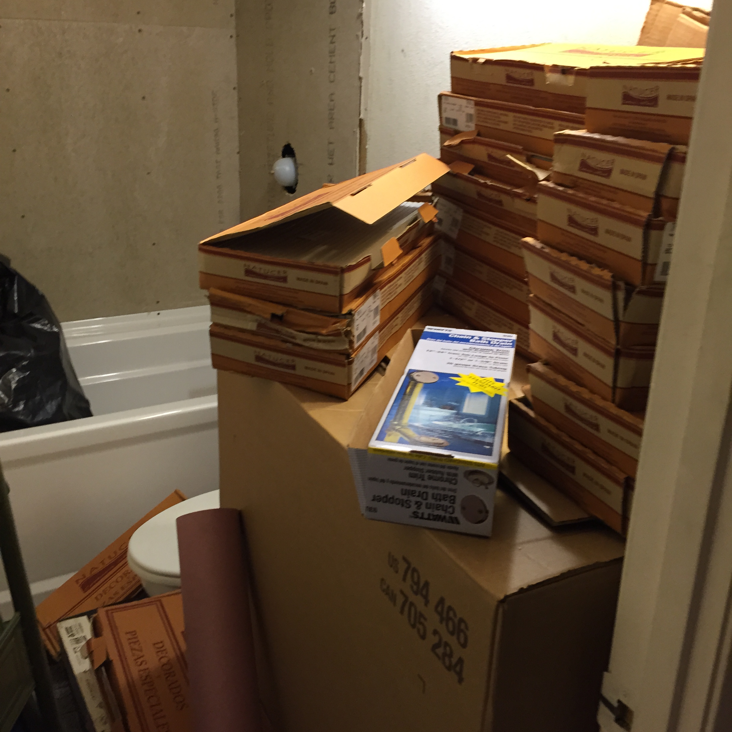Our wonderful contractor arrived by 8:30 on Wednesday, the appointed day, and by the time I left for work, the two plates of glass that had clattered for years to represent a shower door had been escorted out the front door of the apartment. By the time I got home Wednesday, the bathroom was gutted. No more coffin bathtub, no more medicine cabinet.