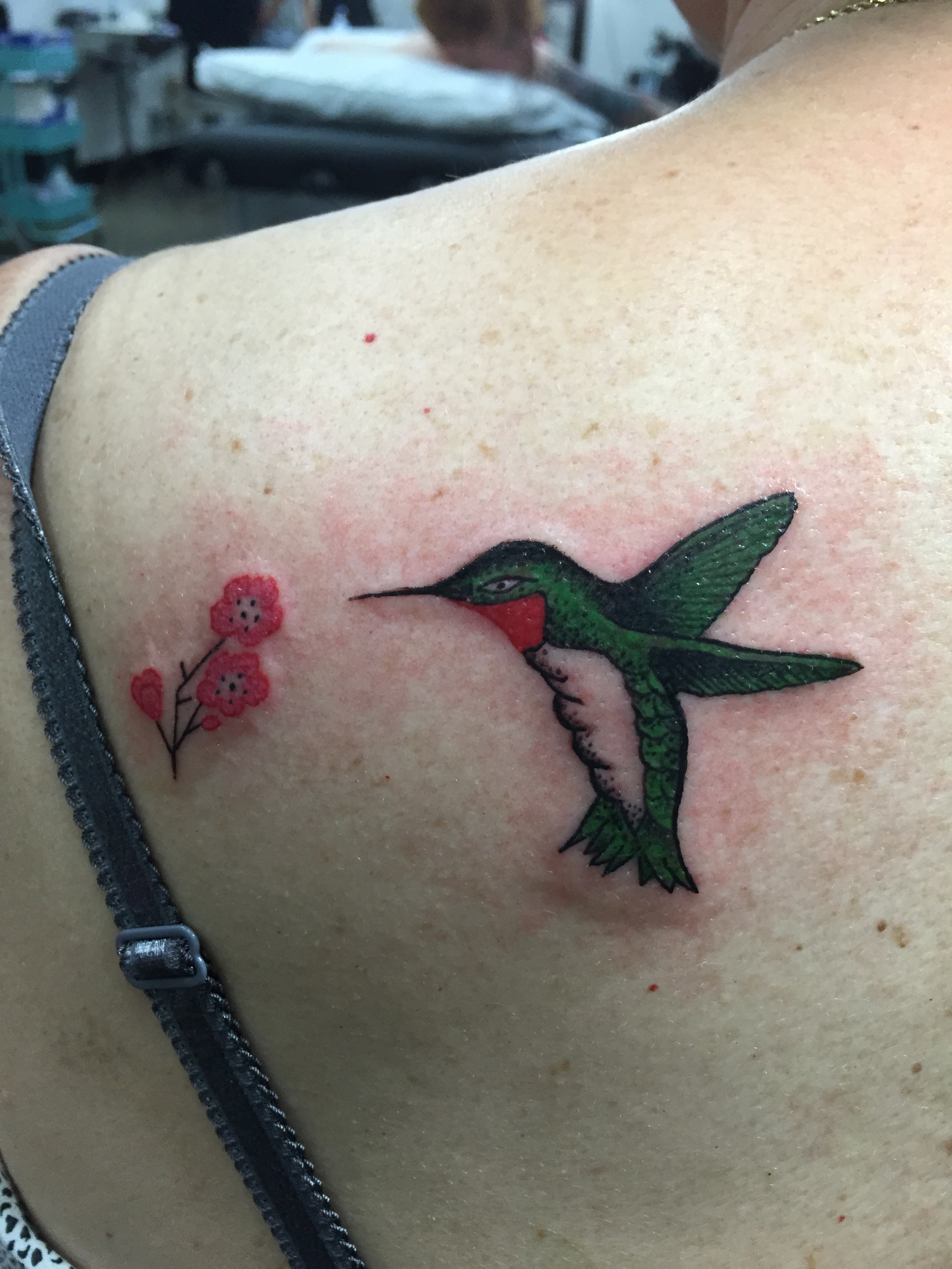 We’ve become obsessed with hummingbirds, starting from when Jimmie and I decorated our patio two years ago with furniture and two hummingbird feeders. Each day, from 7am to about 8pm, we have from 10-15 hummingbirds darting back and forth between the feeders, sparring for access. They are enormously entertaining to watch. Frankly, I don’t know why it took me so long to choose the image for the tattoo, but once I had, it was just a matter of working up my courage and finding the time to do it.