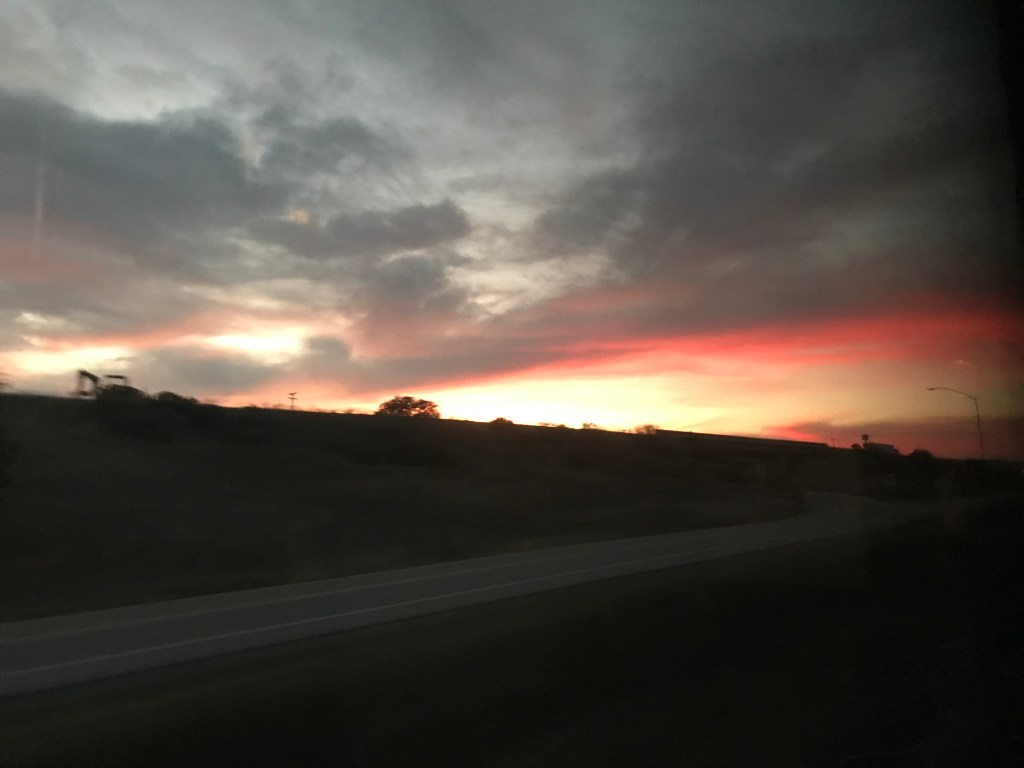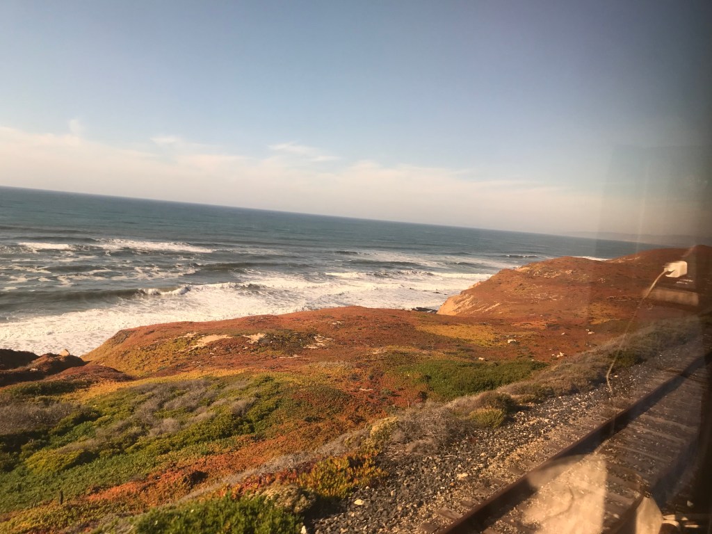 The view outside changed from urban industrial, outside Union Station, to Valley industrial (just a bit less graffiti), to the rocky outcroppings of Simi Valley, before we attained the ocean vistas near Santa Barbara. Nothing between us and the water but rolling banks of ice plants. (Forgive my horticultural inaccuracy – but it looked like ice plant to me….)