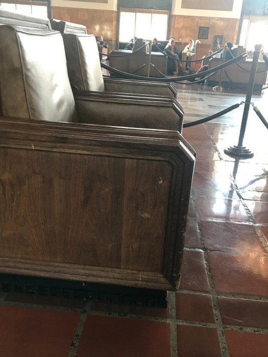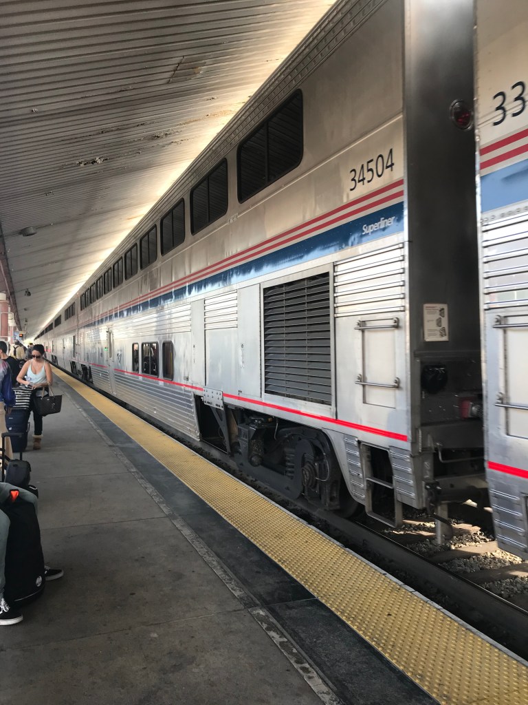 Saturday morning, I arrived early at Union Station with my new suitcase and backpack, enough time to get a cup of tea before boarding the train. When in Union Station I always feel like I’ve stepped back to the 40s, with the Deco chandeliers gleaming overhead, and the solid wooden upholstered benches corralled by brass stanchions burnished by time and heavy use.