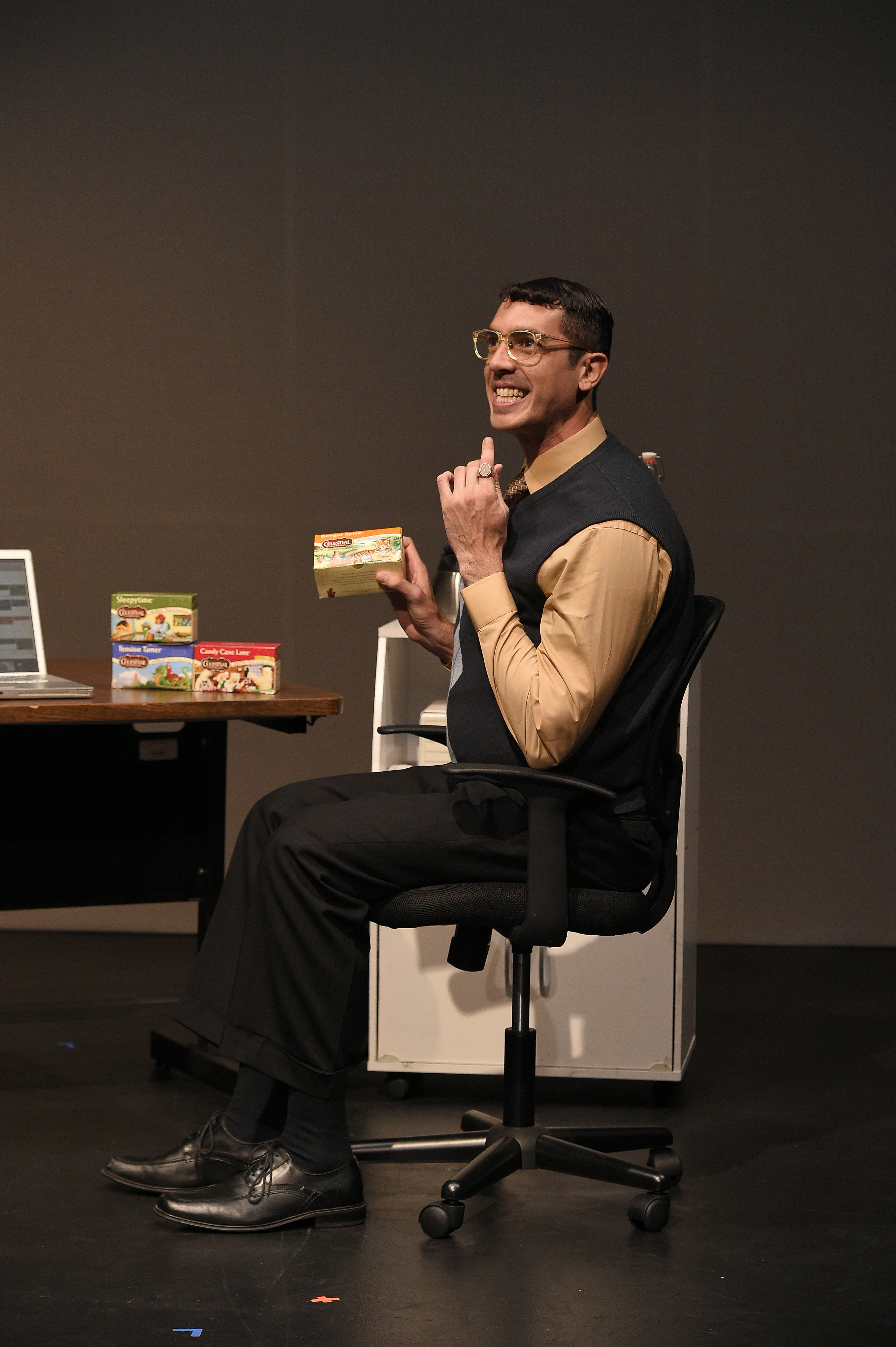 His desk sports a huge display of Celestial Season teas, each one which he tantalizes her with good humored description. Half of us in the audience want to pull up a chair when he intones sibilantly, seductively: