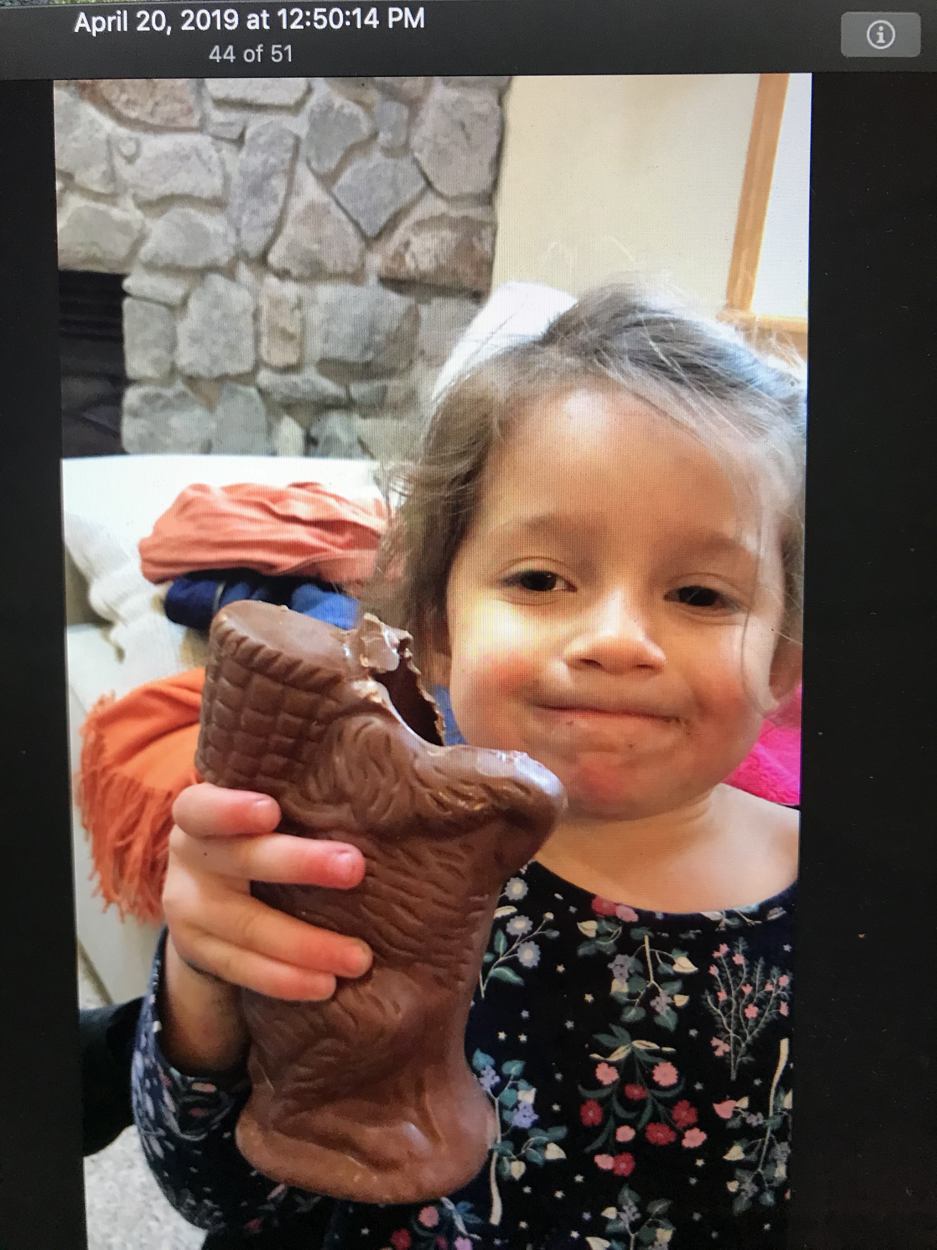 Ask a three-year-old raised in a non-religious household “What is Easter?” and you get pretty much what you’d expect, especially if she’s clutching the headless 12″ chocolate rabbit Nana brought her, methodically munching her way down his torso.