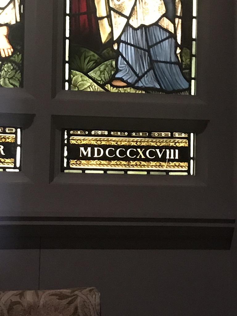 On Saturday, Martha and I took a long passeggiatta (I’m going to become very annoying in the coming weeks as I pepper my writing with Italian phrases, so I’ll provide a little translation as I go). A passeggiatta is an Italian family stroll usually after dinner. I remember when I was working in Gibbelina, Sicily umpteen years ago on a project directed by Robert Wilson, there was a lovely campo (open plaza) where families with their children walked around greeting each other and shared the night air. Martha’s and my passeggiatta was during full daylight and measured about 4.5 miles at the Huntington Gardens in Pasadena. It was lovely, and we didn’t greet anyone. However, we ventured inside the Huntington Mansion Museum where I was temporarily stumped by the Roman numerals on this massive stained glass piece. Quick, no cheating, now. What’s the date? As I was trying to suss it out, I couldn’t help practicing the date in Italian: Milleottocentonovantotto. There, that’s your hint.