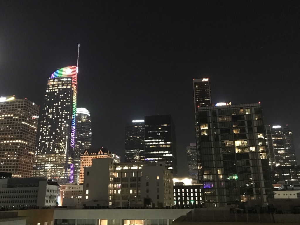 Last night, as we drove back from Pasadena, we witnessed the splendor of DTLA lit up for Gay Pride Month. I couldn’t take a picture from the best view because I was driving, but when I got home, I captured this picture.