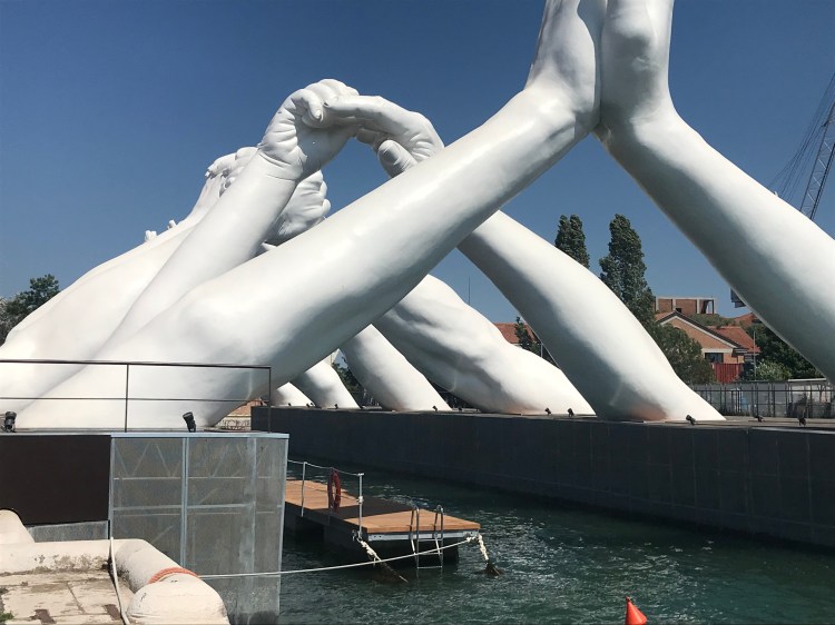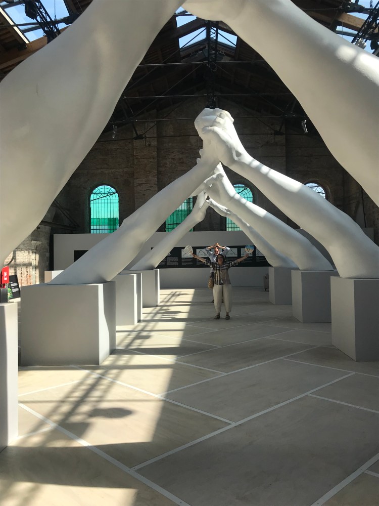 And yet, in spite of these changes, my heart skips a beat whenever I think of Venice. We spent two days exploring the 58th Venice Biennale, the annual international contemporary art festival which features artists from all over the world in pavilions (padiglione) scattered through both the large Gardens, but also in the Arsenale, the military fortress and ship yard just before you reach the gardens. A few of our favorite things we found in the Arsenale were the study and actual realized bridge of hands by Lorenzo Quinn, and nearby, outside the Arsenale, the Lithuanian Pavilion’s evocative Sun and Sea, challenging us about climate change.