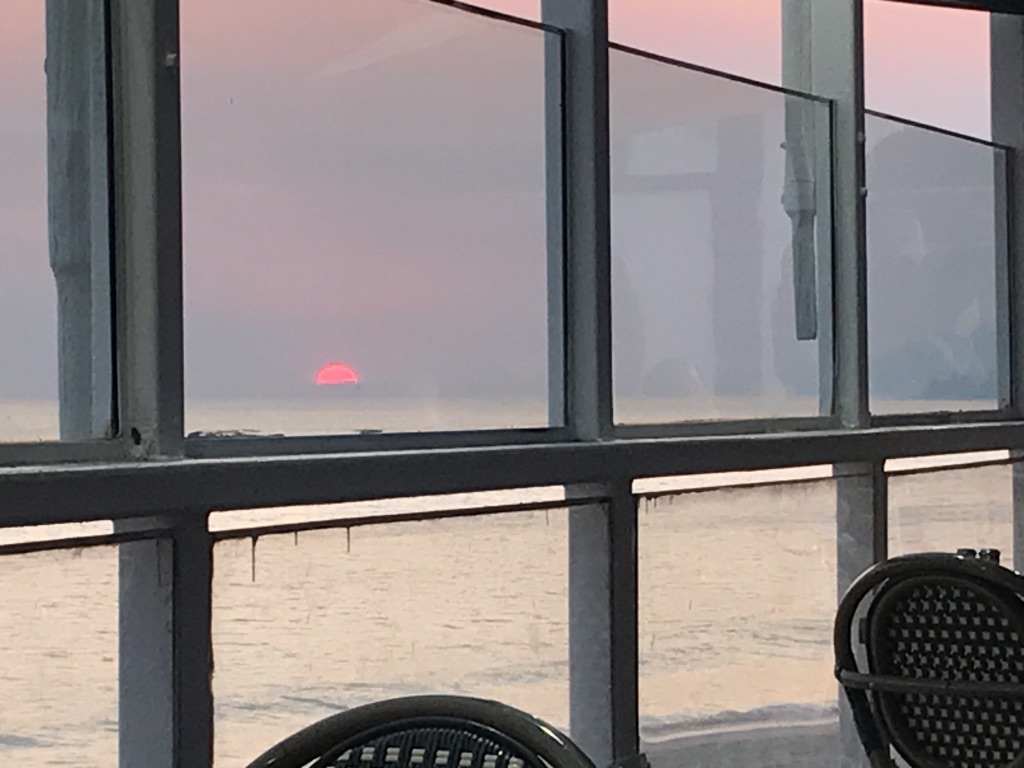 Friday, after kidnapping Caro from the airport and driving her to Malibu, we had dinner at Gladstone’s, sitting outside, smelling the seasonal fragrance of the local fires, and watching the blood-red sun sink into the Pacific Ocean as we waited for our dessert and coffee to arrive.