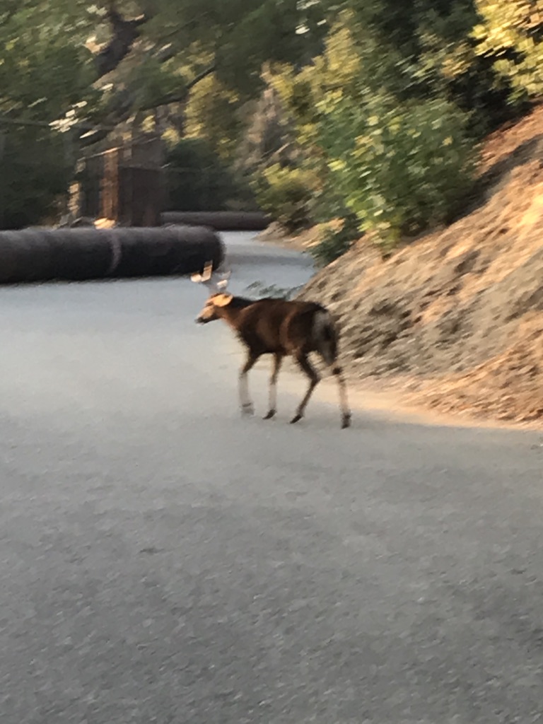 With the Air Quality Index at a surprisingly reasonable 73 Saturday, I headed off to meet my brother. As we began the walk, we talked about the initiation rite that is the first earthquake experience in California. Having just arrived a week or so ago, he and his wife are still unpacking. I remembered seeing the huge mirror in their living room and cautioned him not to hang it over the sofa or bed. These are the things hopefully one doesn’t need to learn the hard way, but without the reminder last night, I’m not sure I’d have reminded him to buy water, keep shoes and a flashlight by the bed, and secure heavy things to the wall. As we chatted amiably, while picking up trash, we witnessed this old buck in the street. He teetered a little unsteadily, and after greeting his pals on the other side of the fence, he turned and started up the hill, pausing to scratch his antlers against a convenient tree. Every time I go to walk I think “I should take some carrots.” And then I forget. Speaking of old bucks…