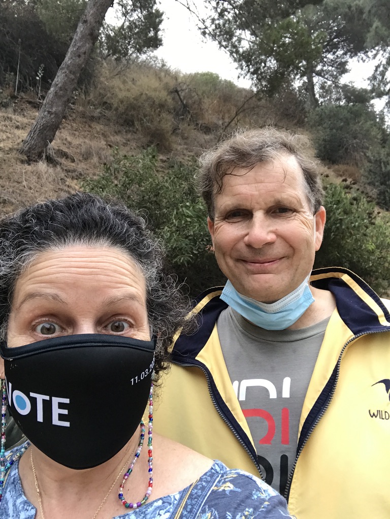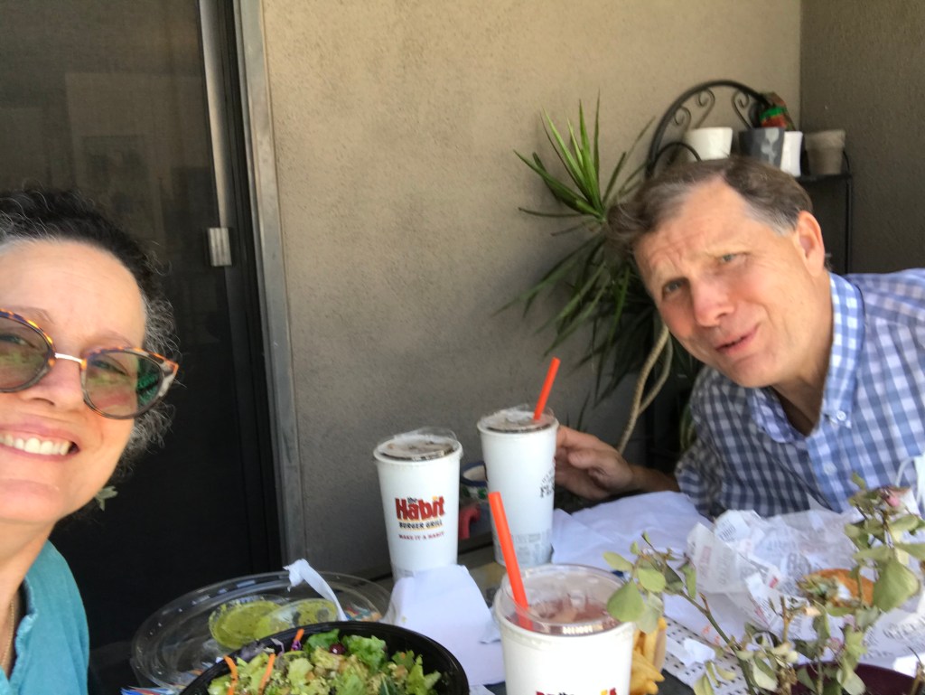 Wednesday I received some additional support from USC’s IT department, in the form of a booster for my zoom connection. I invited my brother over to assist with me with the install. I promised him lunch after we got it up and running. Don dove in and pulled out the equipment, plugging in everything which was soon running smoothly, thanks to FaceTime with the ITS technician. We walked to the Habit, then returned to eat on my patio. Shortly after I took this goofy shot almost dropping my phone to the street below, Don noted: