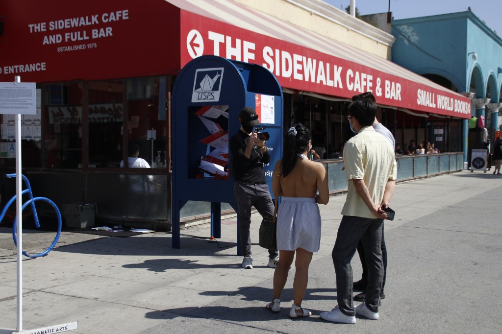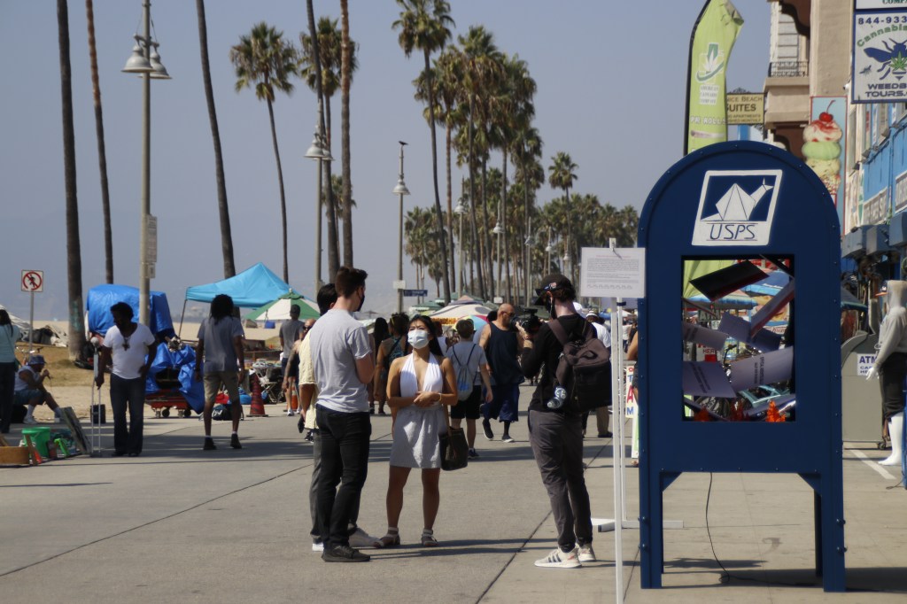 With tech happening far from campus, surprisingly, there were still physical projects happening this week in our technical theatre lab, including the build and paint of a Goliath-sized USPS postal box, part of the Empower the Vote: From Suppression to Expression. This piece of installation art had it’s literal “moment in the sun” on Friday, courtesy of The Sidewalk Cafe in Venice, where student stage manager/designer Harrison Newton shared it with the many passersby. I hope you will check out these students’ project when it launches Oct. 2nd – USC School of Dramatic Arts.