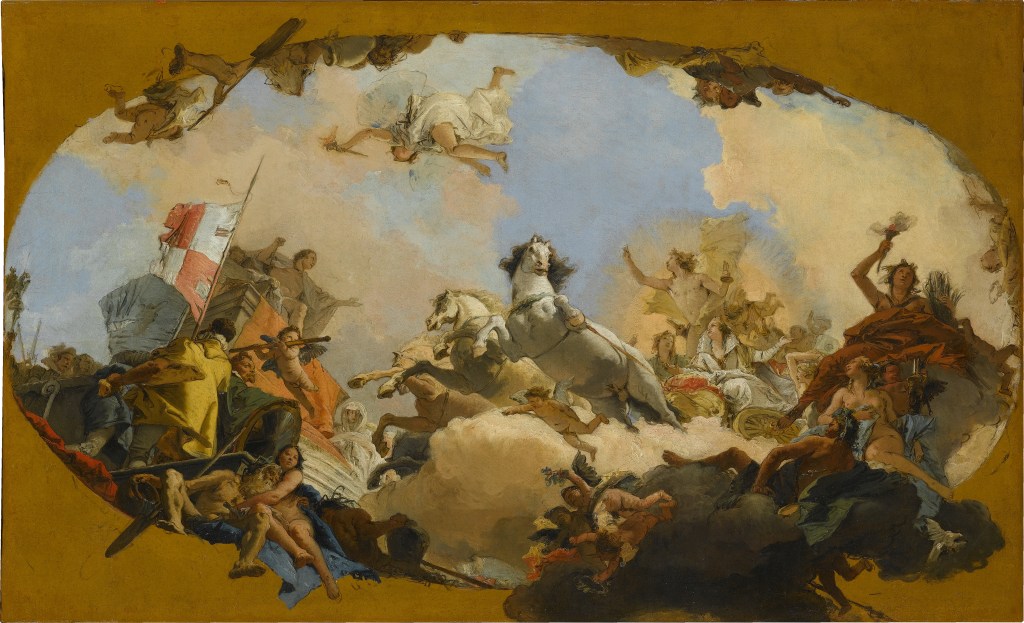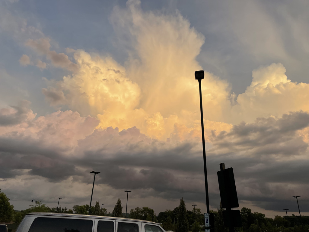 When I emerged from the store, the clouds above were performing a Tiepolo painting, golden and pink. I half expected a flock of saucy putti or stallions to come down and alight on the street light in the parking lot. I stopped in my tracks, holding my camera up to capture the exquisite sight. A scornful teen watched me, then looked up. As I got in the car, I looked back and he was standing with his phone pointed up. Instant validation.