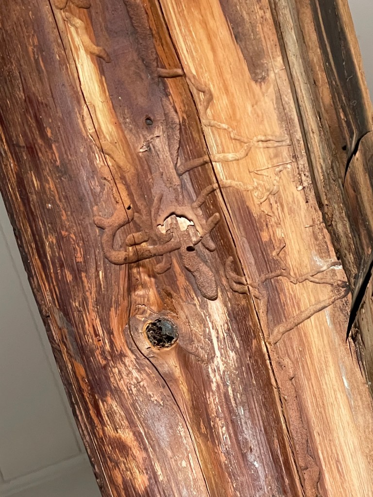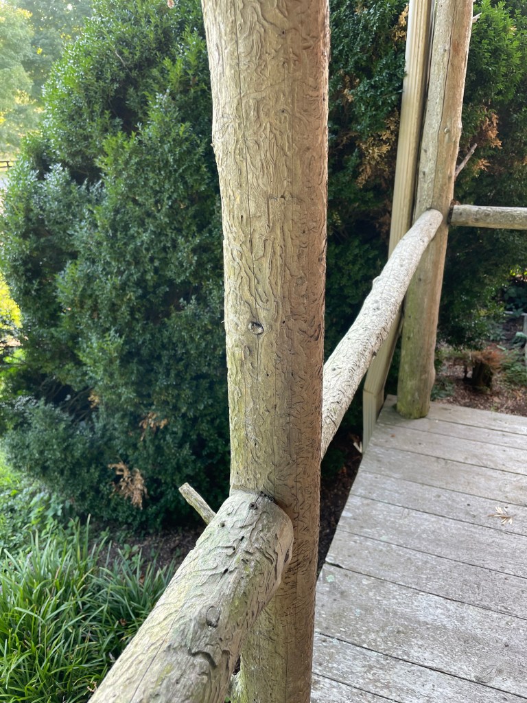 So here instead are a few photos from my porch and also looking up at the beams over the desk where I’ve been working this week. There are these beautiful undulating paths through the wood made by whom? If you have the answer, I’d love to hear what you think made these paths. I looked up wormwood, but don’t think that’s the same thing.