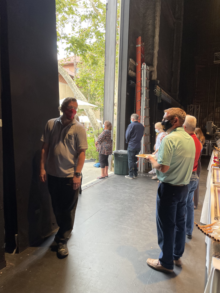 Kudos are deserved by our amazing events staff and Academic Services office. By 11:30AM when the doors opened for this event, I was already exhausted just from attending the previous two days events, and I had had nothing to do with making these events happen. I know from producing events what’s involved in that lift. All that goes in to making the event be really fun and effortless for the guests requires a great deal of effort. Plus with the Delta Variant raging in Los Angeles, there were last minute changes to events protocols which necessitated a complete reorganization of the tables where the students were able to eat. Gathering for the meeting portion of this event, the Bing Theatre hummed with the pent up excitement of 150 theatre students emerging from the chrysalis of their pandemic bedrooms. They were bonding with each other even before the student performers came out on stage and got them up on their feet to perform Time Warp from Rocky Horror Picture Show. At the end of the meeting, the curtain went up and the elephant doors of the backstage were open, showing the Tommy’s burger truck outside.