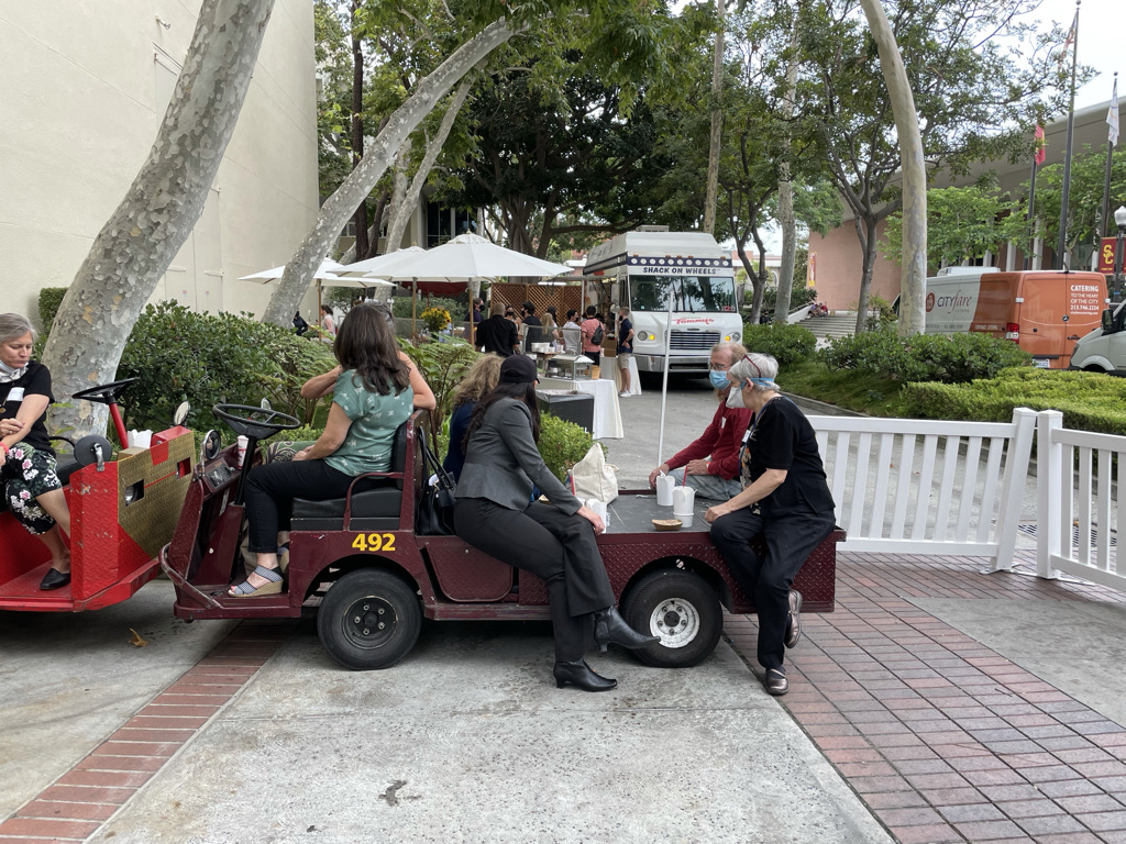 Kudos are deserved by our amazing events staff and Academic Services office. By 11:30AM when the doors opened for this event, I was already exhausted just from attending the previous two days events, and I had had nothing to do with making these events happen. I know from producing events what’s involved in that lift. All that goes in to making the event be really fun and effortless for the guests requires a great deal of effort. Plus with the Delta Variant raging in Los Angeles, there were last minute changes to events protocols which necessitated a complete reorganization of the tables where the students were able to eat. Gathering for the meeting portion of this event, the Bing Theatre hummed with the pent up excitement of 150 theatre students emerging from the chrysalis of their pandemic bedrooms. They were bonding with each other even before the student performers came out on stage and got them up on their feet to perform Time Warp from Rocky Horror Picture Show. At the end of the meeting, the curtain went up and the elephant doors of the backstage were open, showing the Tommy’s burger truck outside.