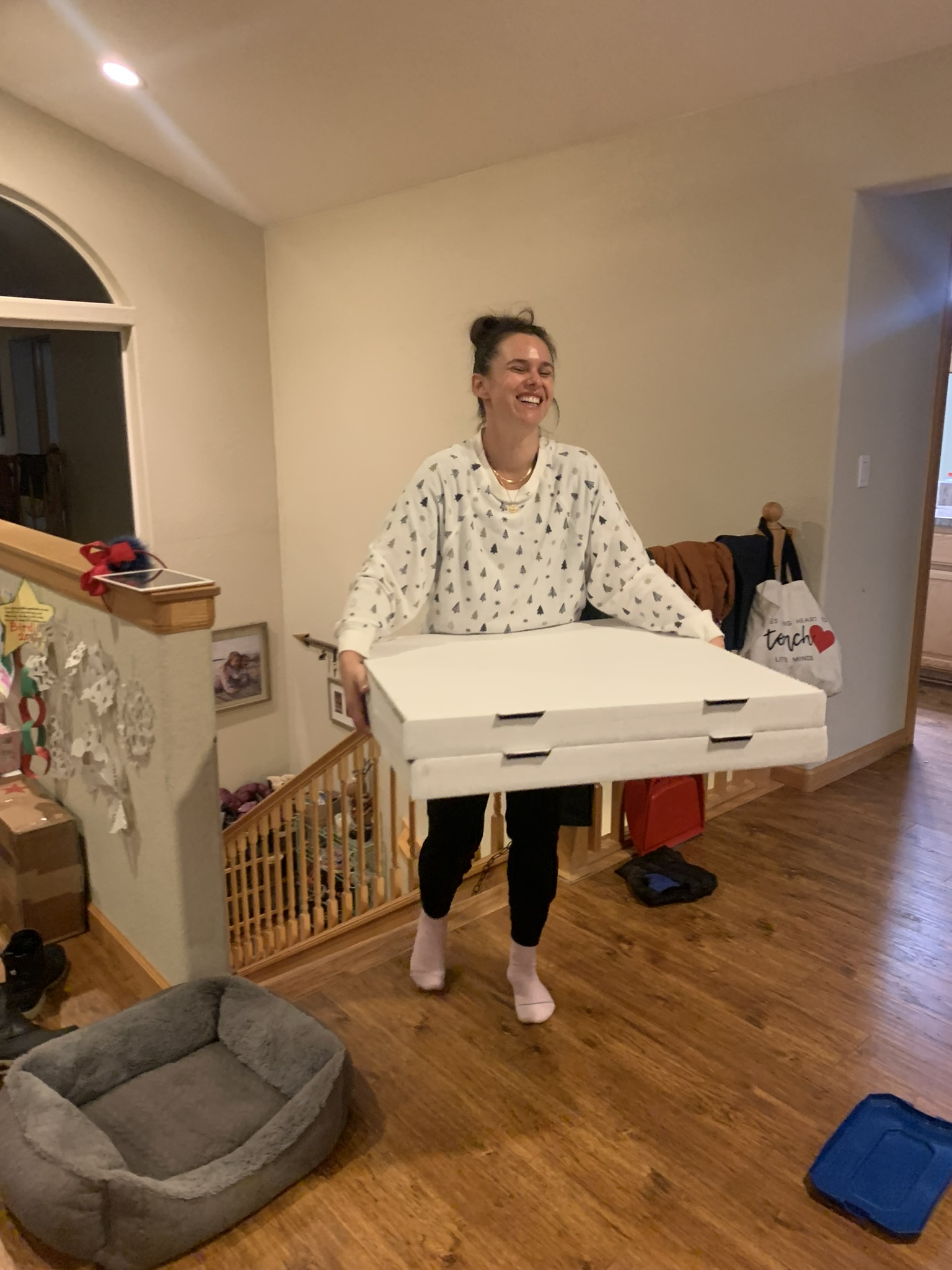 Finally, the cake was iced, and sprinkled and truly ready for prime time. Just in time for the arrival of our sledding pals, who had been invited for pizza and cake. The pizzas arrived, ludicrously large and suddenly were having a party!