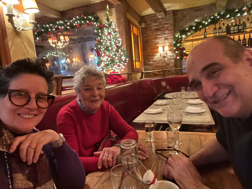Christmas was low key, but important to be with Bob at a crucial time of change in his life. Brass Ring comes to mind as the image. Wisdom words #1: Know that you deserve the Brass Ring and go for it, and once you’ve caught it, hold onto it! We went out for a festive Christmas Eve dinner with Bob’s friend Rick, made matzoh ball soup for Christmas and worked on Marie Kondoing his New York apartment for an upcoming life change. We had brunch with our mutual friend, Barbara at the Empire Diner, another festive social outing.