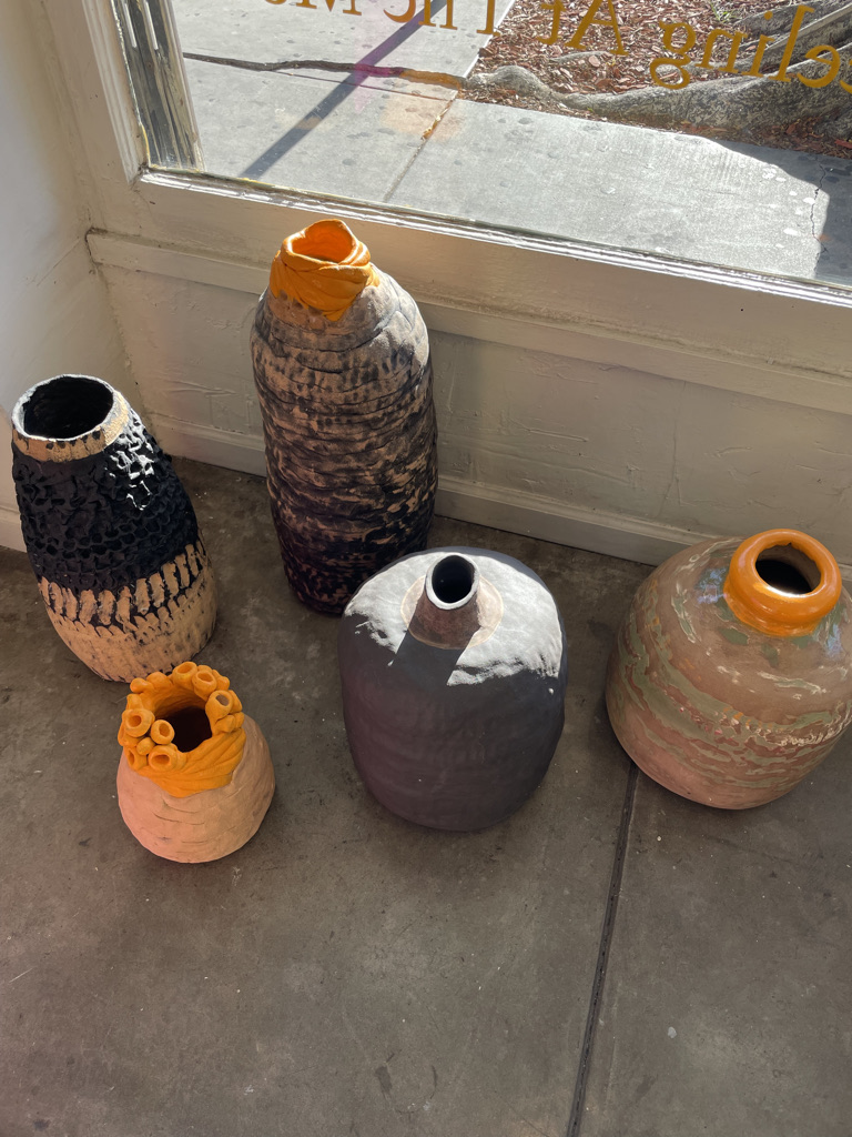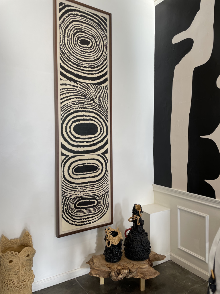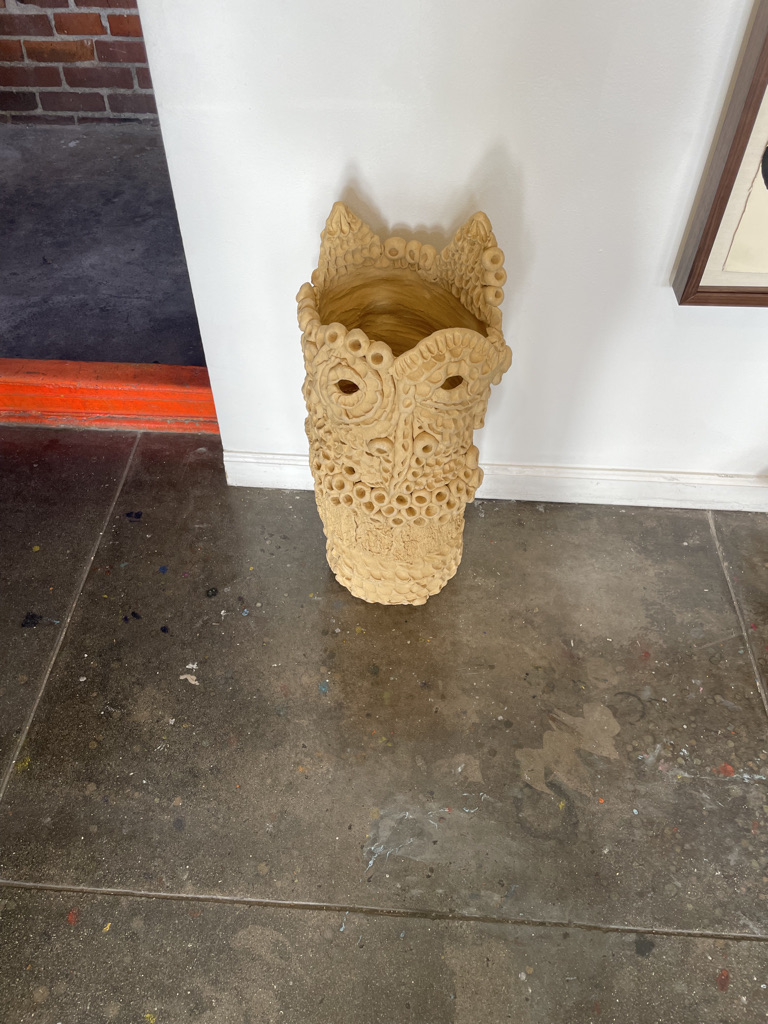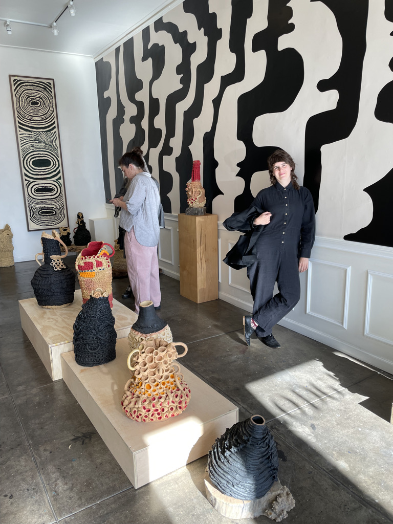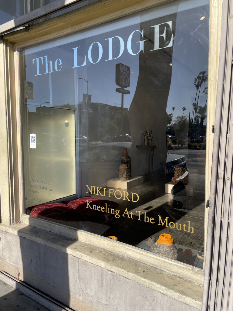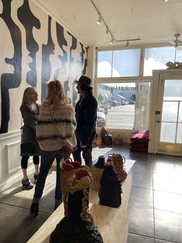 Thursday night, I attended the gallery opening of my great nibling, artist Niki Ford, at The Lodge in East Hollywood. Kneeling at the Mouth by Niki Ford is just another step in the astonishingly creative path they continue to carve through the world. I know I’m not alone in my admiration for the unique visual voice with which they speak – it has already been identified as a “must see” on Artforum; this small but mighty show shares an arc of work by Ford that is stunning and which we’ve watched evolve from a celebration of two dimensional undulating line drawings to 3D vessels whose expressive imperfection seem to burble joyously from many mouths into the space.