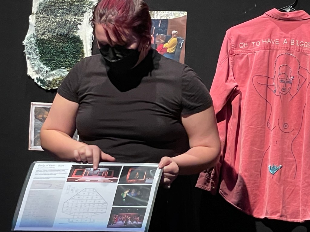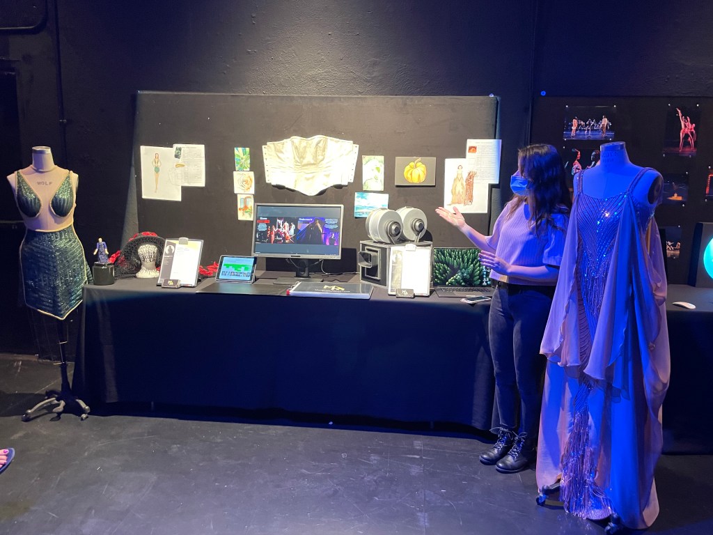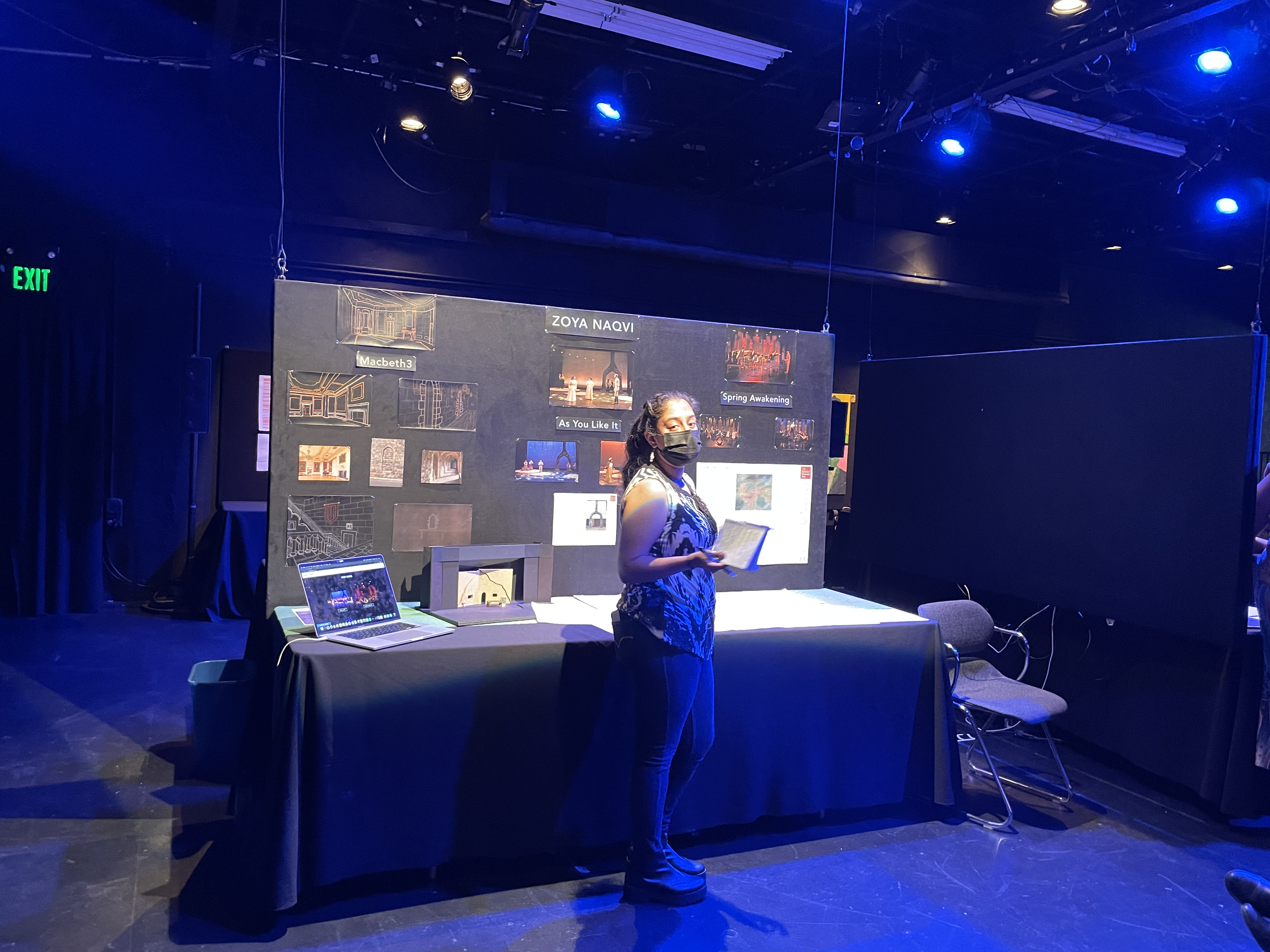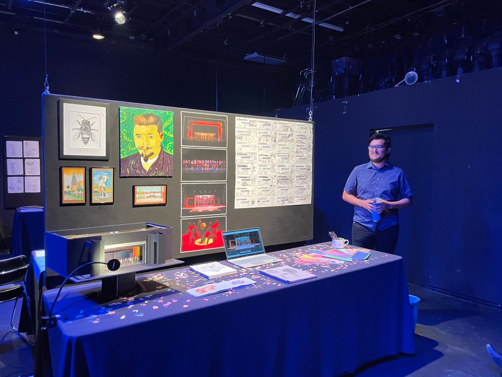 There was a palpable feeling of celebration, fear, emergence and possibility aloft in all the spaces we inhabited. The staff had all supported the elegant exhibition space, complete with speakers for the sound designers, focused lighting tightly containing their tables and backboards, but featuring them as they stood in front of the tables to tell us about their passages through four years. But beyond the presentations, what was unique and moving this year, the first since we’d gathered in Spring of 2019, were the individual stories of survival and growth as artists through COVID and the post apocalypse.
