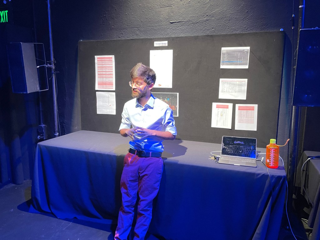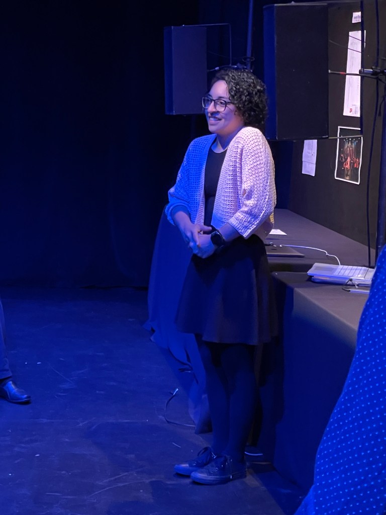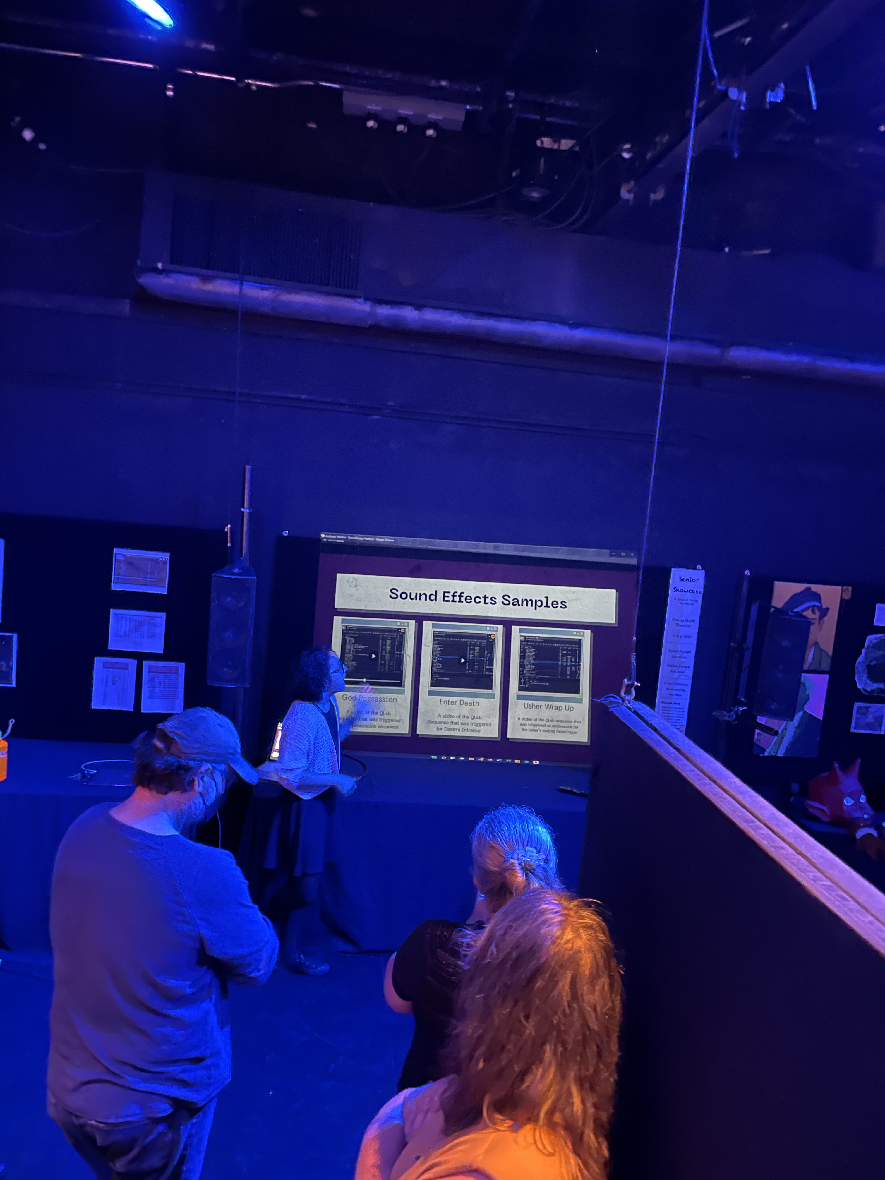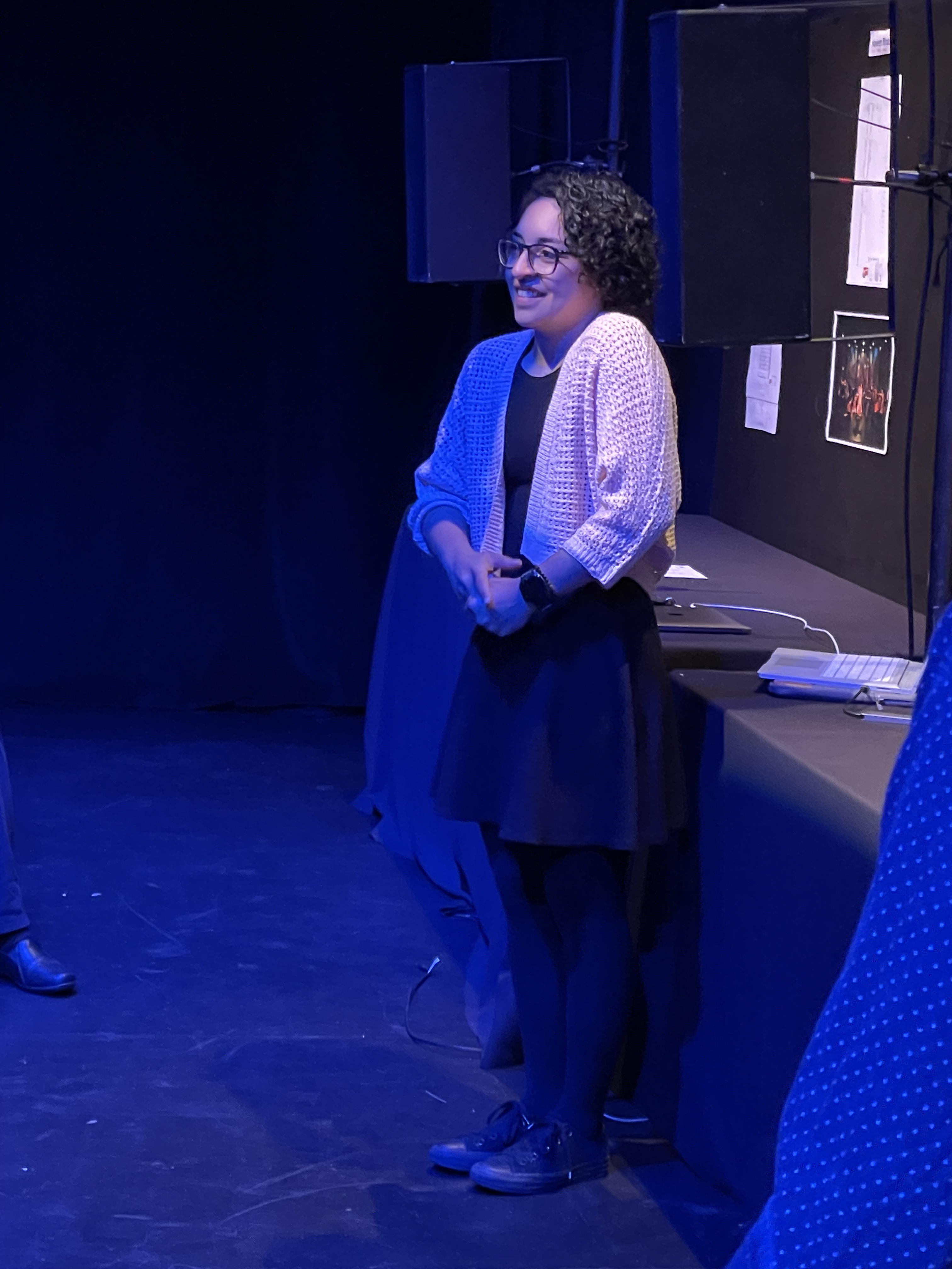There was a palpable feeling of celebration, fear, emergence and possibility aloft in all the spaces we inhabited. The staff had all supported the elegant exhibition space, complete with speakers for the sound designers, focused lighting tightly containing their tables and backboards, but featuring them as they stood in front of the tables to tell us about their passages through four years. But beyond the presentations, what was unique and moving this year, the first since we’d gathered in Spring of 2019, were the individual stories of survival and growth as artists through COVID and the post apocalypse.