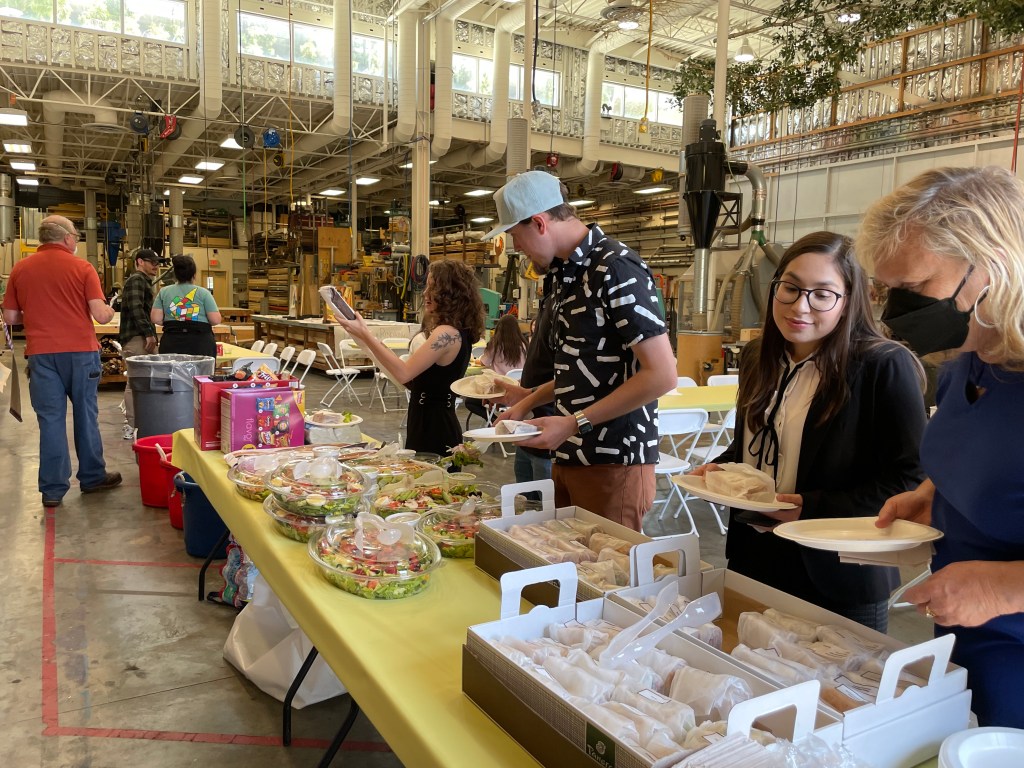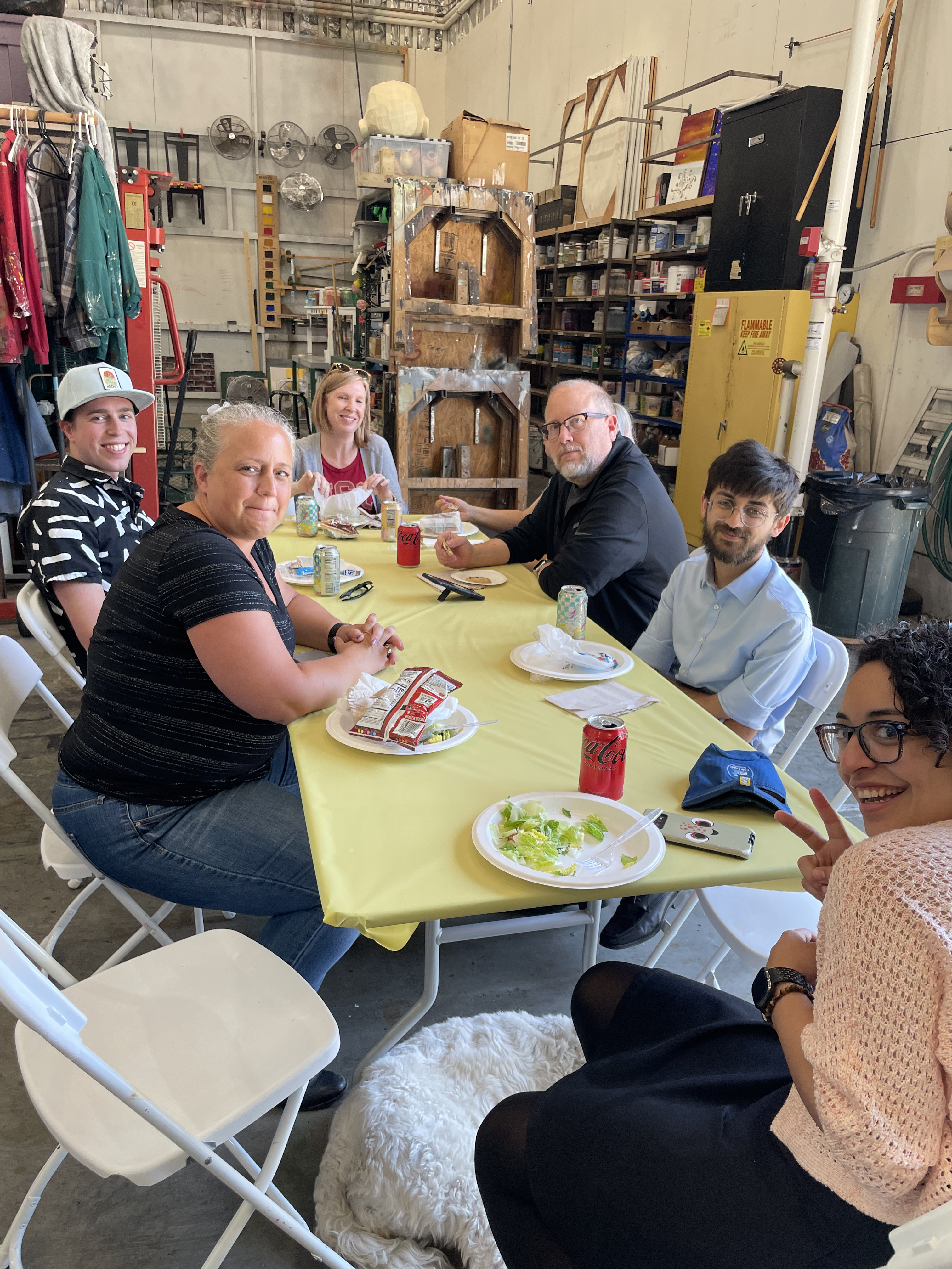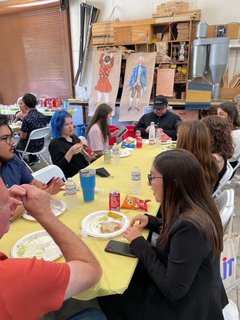 Friday, May 6th, we celebrated the graduating seniors from our various programs, production and design areas in our Design Showcase 2022. Please check out our graduates. I haven’t yet figured out how to clone myself so that I can participate in both the design critiques and stage management portfolio reviews that took place from 9AM-4PM. But we all gathered together for lunch between sessions. The photograph at the top of this post is of that illustrious group of current students, faculty, mentors, alumni guests.