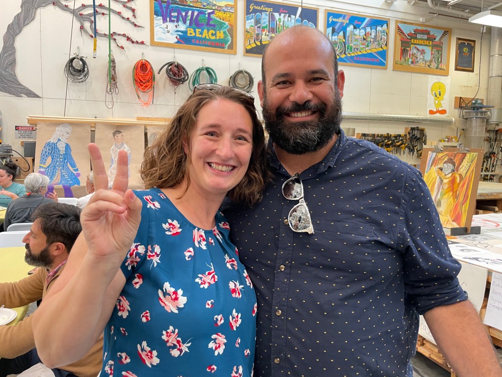 Some moving snapshots: Jesus, moved out on his own, taking an apartment and the financial obligations that came with that decision, shared that he had been supporting himself for the past year as a security guard in Burbank. One corner of his display was a quilt of glassine window envelopes with sketches on them. These had been the material he chose during his shifts to flesh out ideas for his designs, or just draw in different styles. He then invited us to fill out our name and “what inspires us” on the colored slips on the table below and drop them into the envelopes. More than one person wrote something like “You do” or “People like Jesus.” Such an imaginative, authentic, and moving narrative which made real the universal artist’s struggles.