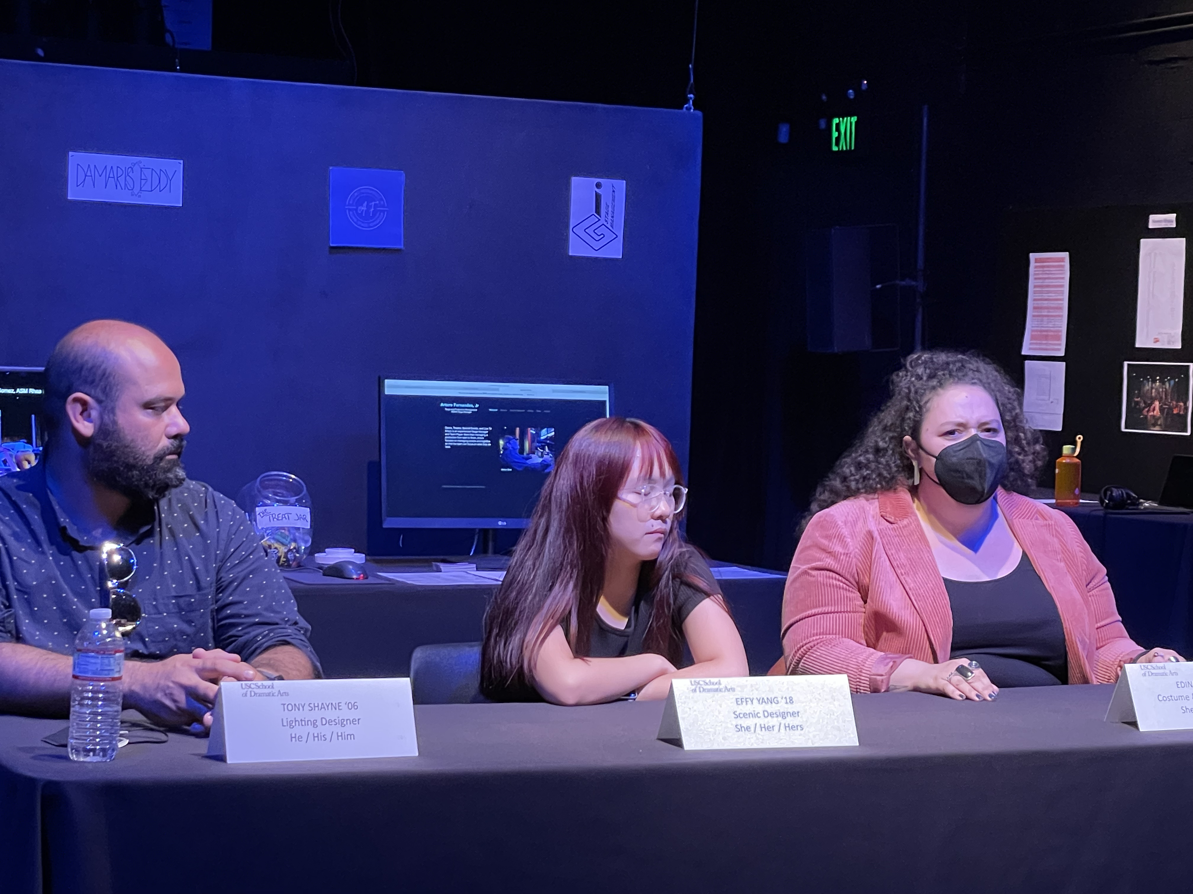 Other snapshots: In the morning session, each of the graduating seniors presented a ten minute showcase of their work, followed by a brief ten minute Q & A to the assembled team of professionals: Chad Smith, Technical Director from Center Theatre Group, Heather Carson, Lighting and Art Installation Designer, Tanya Orellana, Scenic Designer, and SDA Production/Design Faculty in attendance, Tak Kata, Sibyl Wickersheimer, Duncan Mahoney, Phil Allen, Jenny Guthrie, Josh Epstein, Ann Closs-Farley, Terry Gordon, emeritus Faculty Don Llewellyn, and myself. At some point in their discussion, each of which was personal, well-shaped, rehearsed and geared to highlight their journeys and successes, they also shared their vulnerabilities, their humanities, technical and personal things that they had struggled with while on the journey. As Head of Design Takeshi Kata remarked at the end of the session, we got a real sense of their individuality and humanity through their presentations. Their strengths are clear in their work. But it was the first time, for whatever reason that they had emerged from the COVID cocoon fully developed in their sense of themselves, flaws and all, and their unique human strengths.