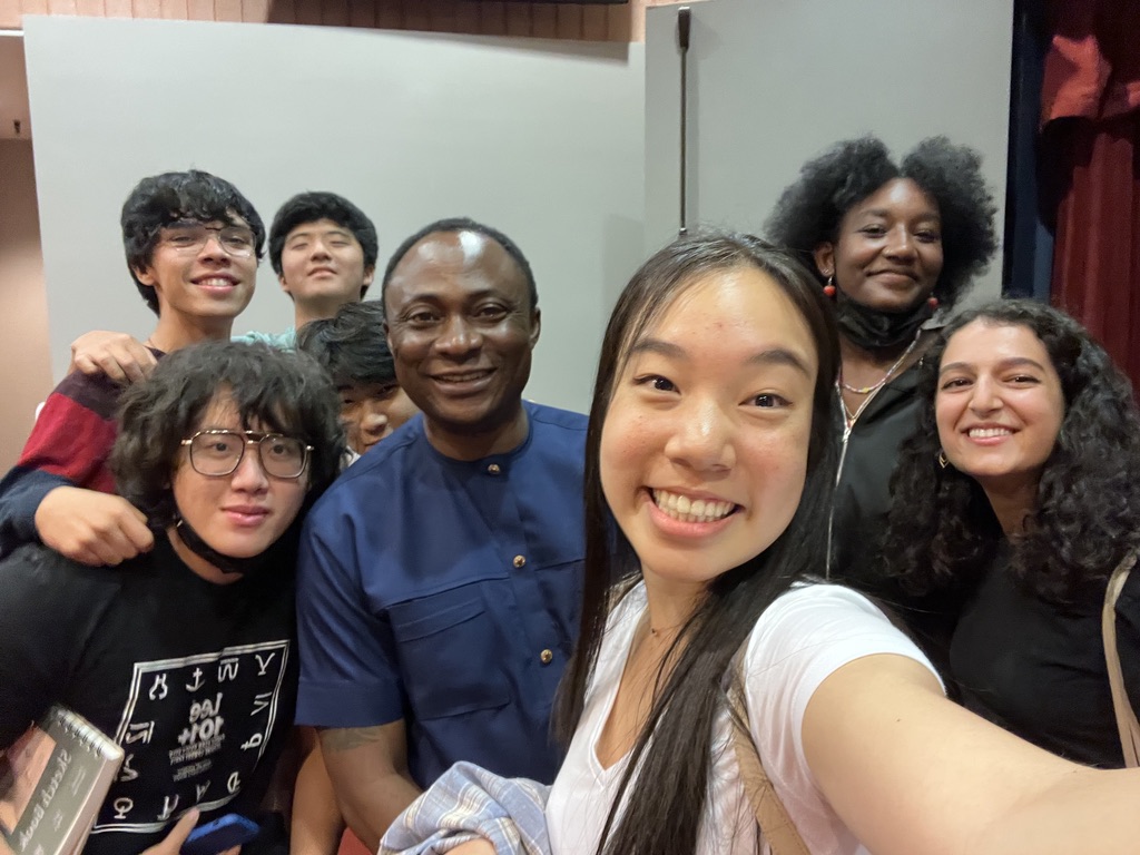 Turning out means hearing the subtext of what you are talking with people about. Underlying issues of self-doubt, figuring where in the grand scheme of things one belongs, standards of self-measurement; all these things factor into issues that are stressing the students, staff and faculty with whom I engage daily. I feel so fortunate to be teaching this GESM each fall, which exposes non theatre students to the process of playmaking and producing plays, through examining closely the texts and the processes of producing. A few weekends ago, with the opening of our first production, Wedlock of the Gods by Zulu Sofola, there was a lot of joy and belonging experienced by everyone who has been engaged in the rehearsal process, as well as my students in the GESM, one of whom sent me photos of her and several classmates who attended the opening night.
