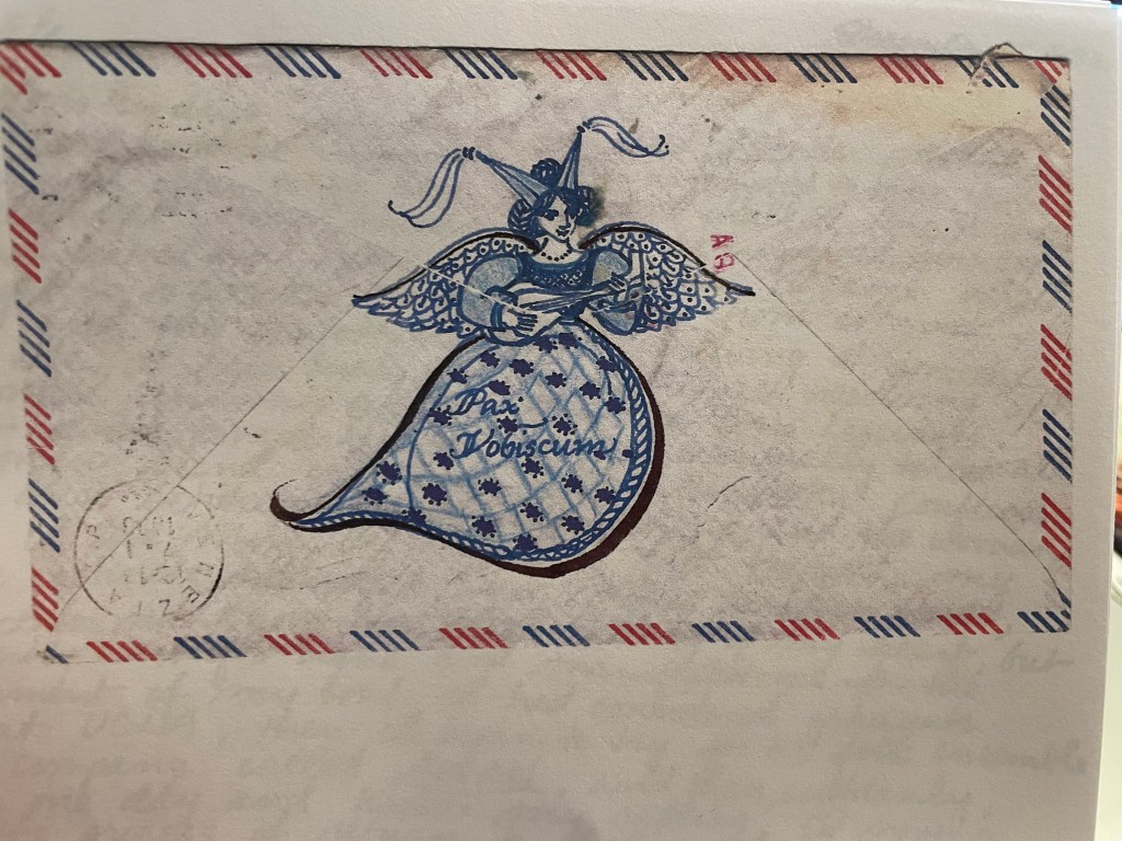 Yesterday’s outreach from the friend via email jostled my memory of a time when we had corresponded after college. It was when I was living in Venice, Italy for a little more than a year, and had taken a job as a docent at the Peggy Guggenheim museum. I went back to look through my journal for that time, but couldn’t find his letter which I remembered had had charming drawings on it. Instead, though, I found a letter from another friend with whom I’d recently reconnected at the 45th reunion of SPS. That letter, the envelope of which was illustrated with beautiful angel, was something I cherished upon receipt right before Christmas in 1982. At the time, I’d been in Venice only about 2 months, and was preparing for a visit on Christmas day from my Mom. Now, forty plus years later, I decided this letter was a “source” document about the friend’s development as an artist, person, and friend.
