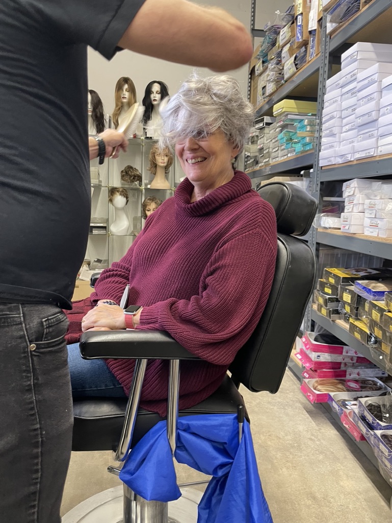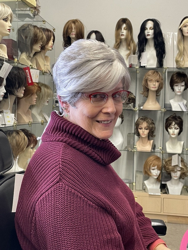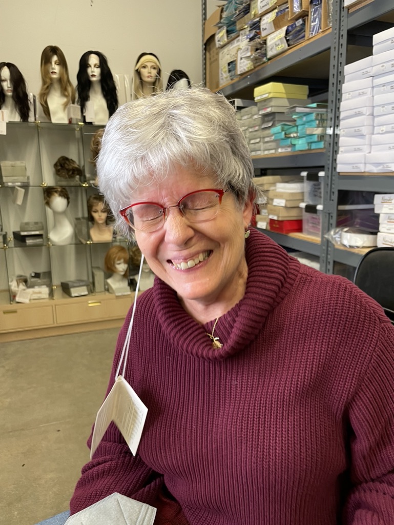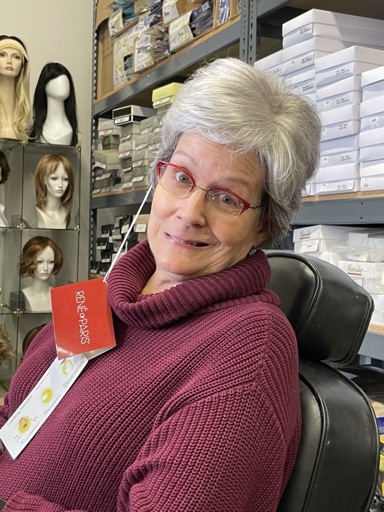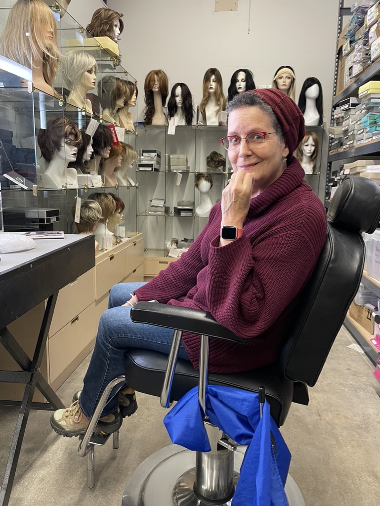 I’m nothing if not a planner by vocation and instinct. Saturday, after a week of self-isolation due to my stye situation, I ventured back to Burbank to try on the four wigs that Naime’s kind employee, Henry, had ordered for me during last Saturday’s venture with Susan. Due to bad car karma, my friend MJ was unable to join me. As it turned out, my new neighbor in the building, Leah, was able to come for this session to “meet the girls.” Did you know that all wigs are named with perky and promising names? Across all brands – who knew there were so many brands of synthetic wigs? I sat in the chair in the back room at Naime’s and awaited the “meetings” as Leah documented for me.