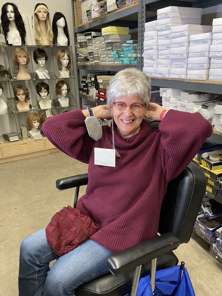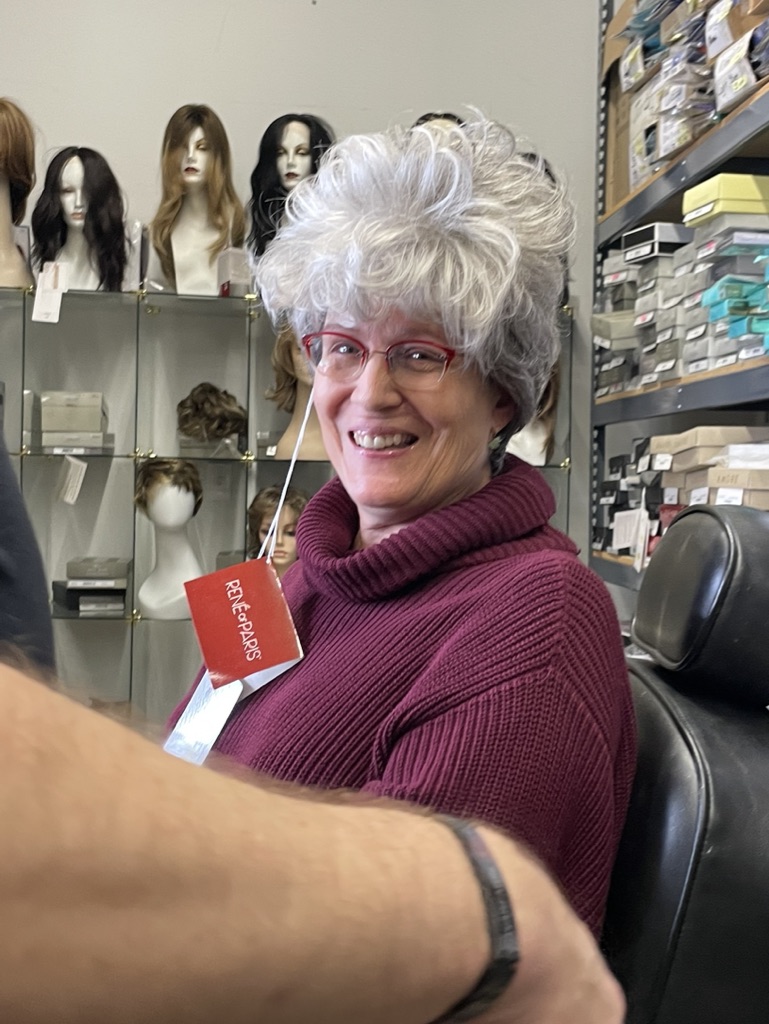 I’m nothing if not a planner by vocation and instinct. Saturday, after a week of self-isolation due to my stye situation, I ventured back to Burbank to try on the four wigs that Naime’s kind employee, Henry, had ordered for me during last Saturday’s venture with Susan. Due to bad car karma, my friend MJ was unable to join me. As it turned out, my new neighbor in the building, Leah, was able to come for this session to “meet the girls.” Did you know that all wigs are named with perky and promising names? Across all brands – who knew there were so many brands of synthetic wigs? I sat in the chair in the back room at Naime’s and awaited the “meetings” as Leah documented for me.