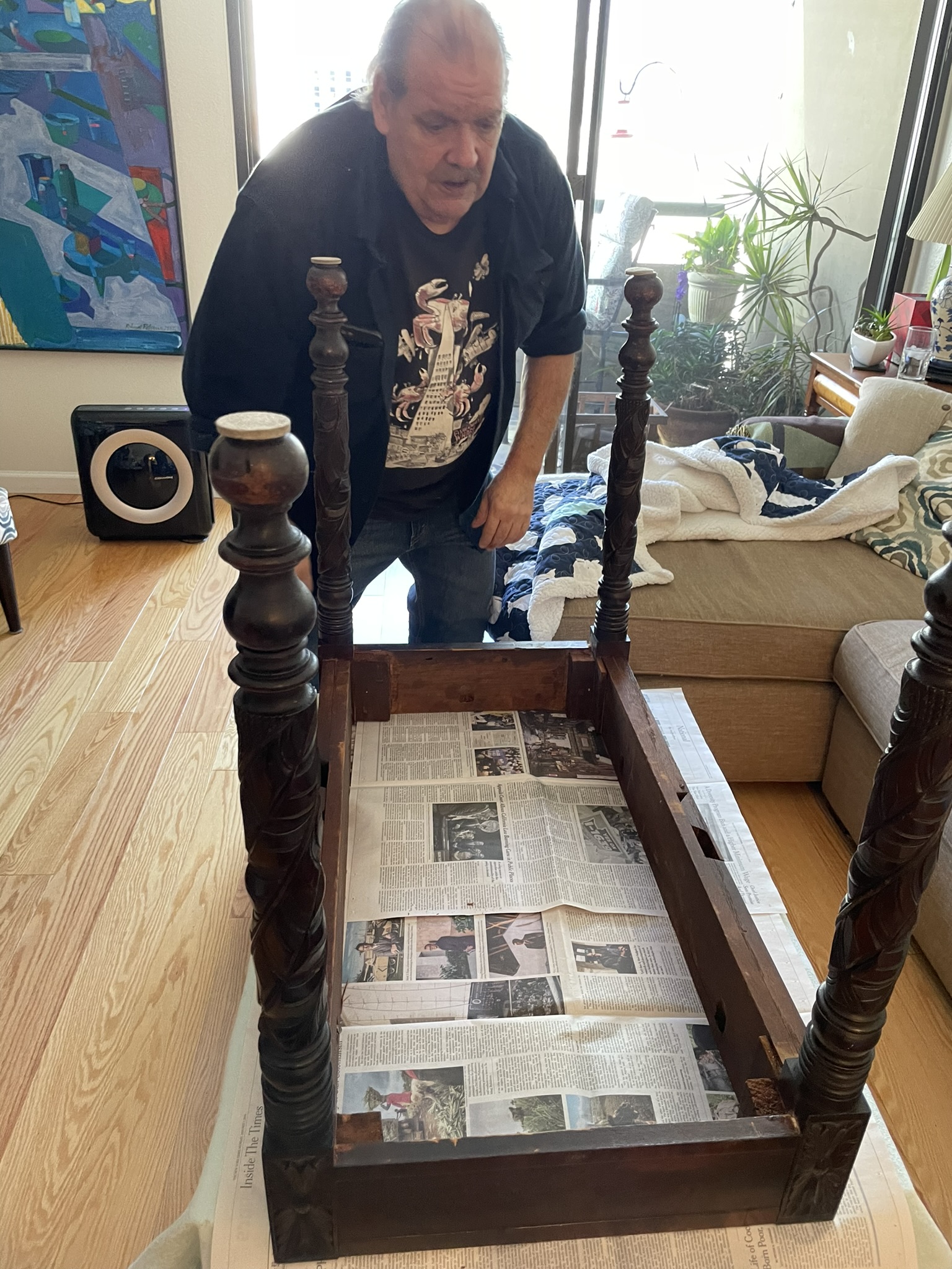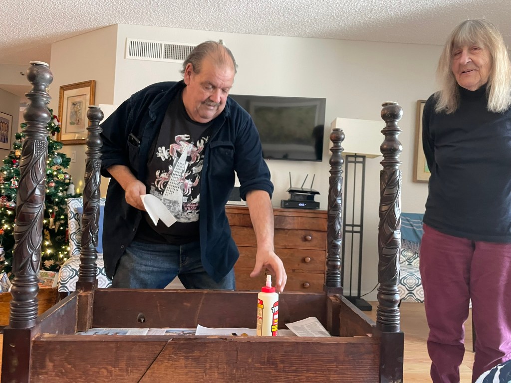 We got some “honeydo” things off the list done while they were here. Took down the Christmas decorations, glued the table with the wobbly legs, and took some artwork to the framer to get non-glare glass instead of the reflective glass that was preventing viewing of the artwork in my dining room. All things that wouldn’t have happened had they not come to help me!