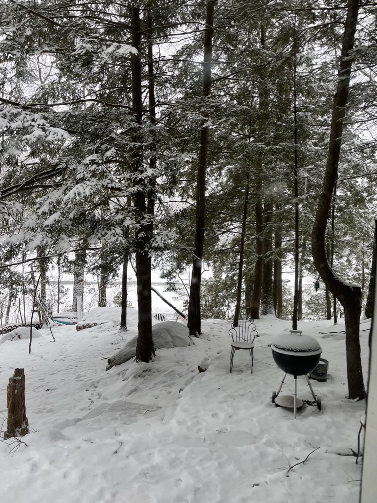 And this bucolic snowy scene was where I finally attempted to do the Annual Great Backyard Bird Count. I had attended a webinar while I was in DC, and I was all prepared to count the birds. I put my chair by Bob’s glass paned back kitchen door, and set my sights on the ground and tree tops, my Merlin Bird App open, and my ebird App poised to rack up a lot of birds. Bob’s dog, Layla, was ready to help me. She sat patiently by the back door (by patiently I mean about three seconds) after which time, she butted her webbed paw (she’s a water dog) against the glass and rapped for my attention.
