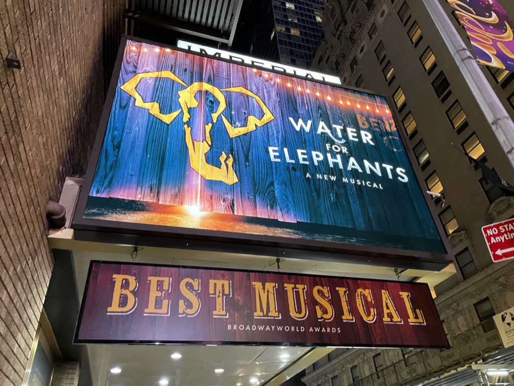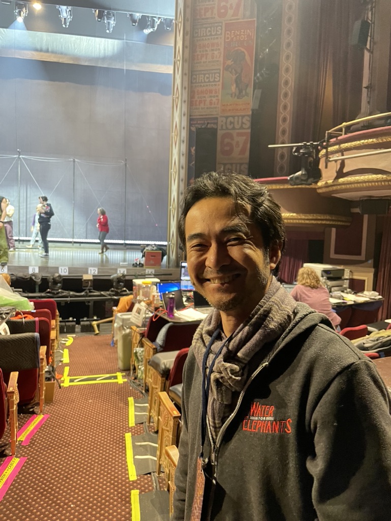 Susan and I met there on Valentines Day and she eschewed dinner due to jet lag but graciously allowed me to go dine with my friends Frank and Jackie at Joe Allen’s. This, too, I would consider a haunt for my flock. It was a terrific meal on a very chilly evening. First, though, I passed through the Imperial Theatre to witness a few minutes of tech for the upcoming musical Water for Elephants, which my colleague Takeshi Kata is the scenic designer. He guided me through the tech table jungle and we sat at his scenic post as some of the acrobats worked a moment on stage. I took this picture of him in his element and here’s a shot of the marquee. Go see it! Starts previews today, I believe! It was exciting to be in the midst of that creative swirl of activity. I made Tak point out who every one was and explain their role in the process.