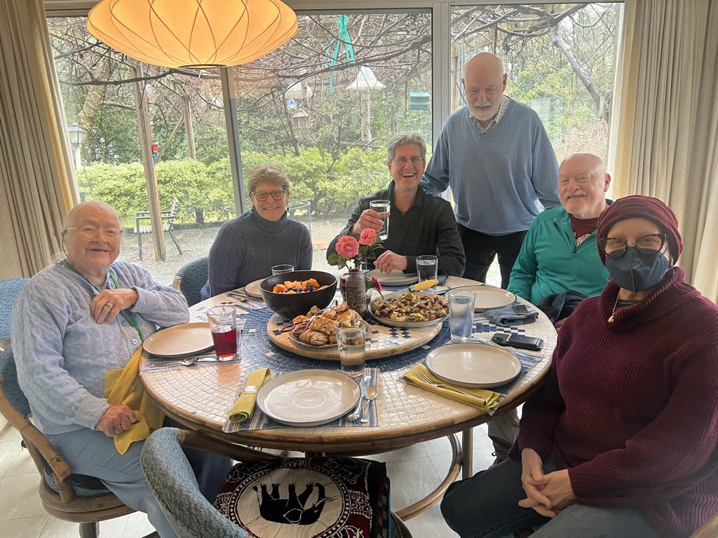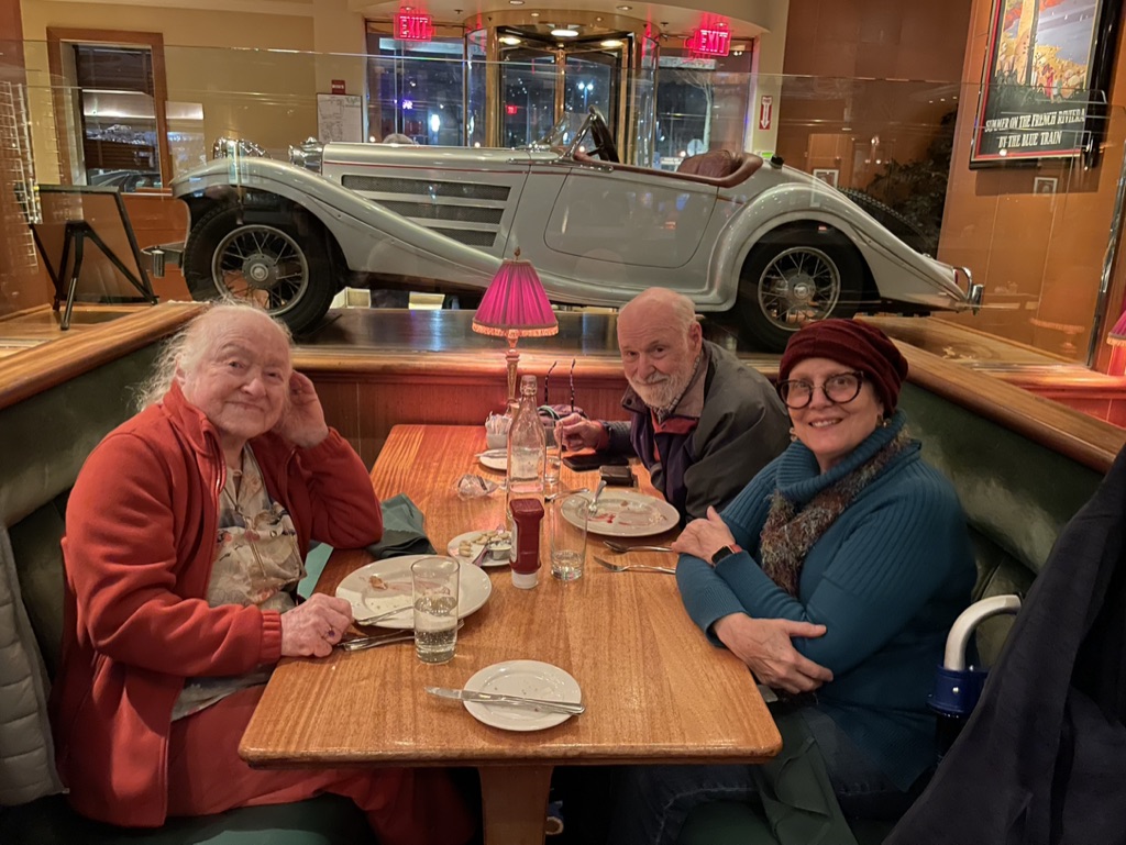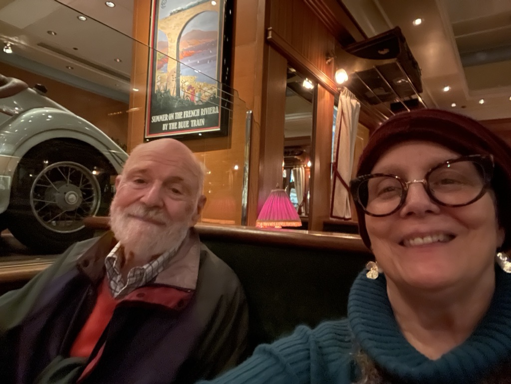 My migration was easy; I took the redeye to Washington, DC landing on 2/10, and heading directly to see my Dad and his wife in their home adjacent to Rock Creek Park, another beautiful spot (in non-inclement weather) to walk. We had a delightful few days, puzzling, and chatting and exercising on the athletic field of the adjacent school. We dined out at Clydes, one of their favorite haunts. Sunday, we had planned to attend a brunch with our cousins, Julie and Mark, at the home of Julie’s sister Sara and her husband, David; however, our plans were interrupted by a 24-hour bug. Sara and David nevertheless brought the food by and we had a festive brunch. We will have to connect next time I’m in town!