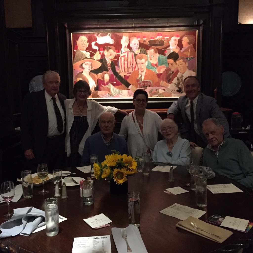 My last trip to the Algonquin (Gonk) was in June 26, 2016, when a group of us including my talented artist aunt, Irene Neal, made our way to Manhattan. We were hardly the Vicious Circle depicted in Kevin C. Fitzpatrick’s The Algonquin Round Table New York: A historical guide (thoughtfully given to me for my birthday by flock friend Mary Joan) but we fancied ourselves wits. We took the requisite photo at the then-round table. Terrible lighting of us and terrific lighting of the painting resulted in this photo which only documents the participants and certainly doesn’t win any photography awards. But we did have fun on that trip, walking a lot and laughing as much.