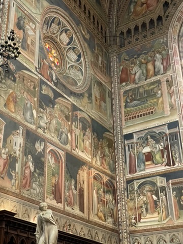 That evening, we split our party up and Sally and I went to nearby Todi to hear a concert in the palazzo of our host Marina’s Uncle Carlo while Bob went off for Pizza with Ouida and the Frasers. We had come here five years ago and the choirmaster was the same person who had shepherded the teen choir to sing in the grand room of the Palazzo. This time it was a group of about thirty adult singers and the power of their voices was notable in the room which is decorated with late nineteenth century representations of fantastical and imaginary Italian scenes. I didn’t take as many shots this time as I did in 2019 but you can see more in my blog from that time.