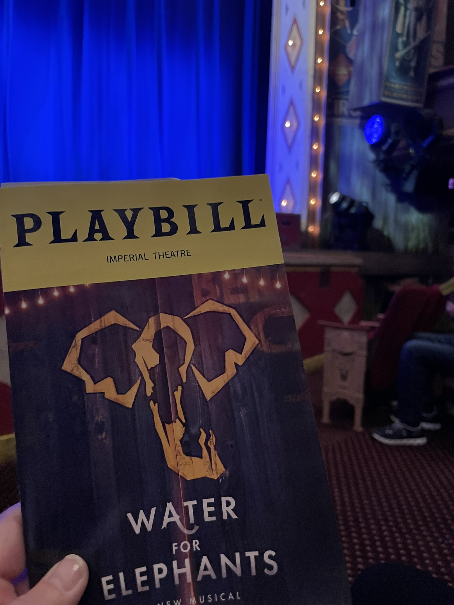 We took the subway down to the show and couldn’t believe our good fortune with the half-priced tickets we had scored. The show was thrilling. The gorgeous scenic design by Takeshi Kata begins with the circus wrapped proscenium draped with a royal blue house curtain. The front of the pit separating us from the musicians sports the vibrant colors of the Benzini Circus and what looks like miles of wear from travel and scuffed at the base by “kinkers or rubes.” The lighting design by Bradley King is dazzling.