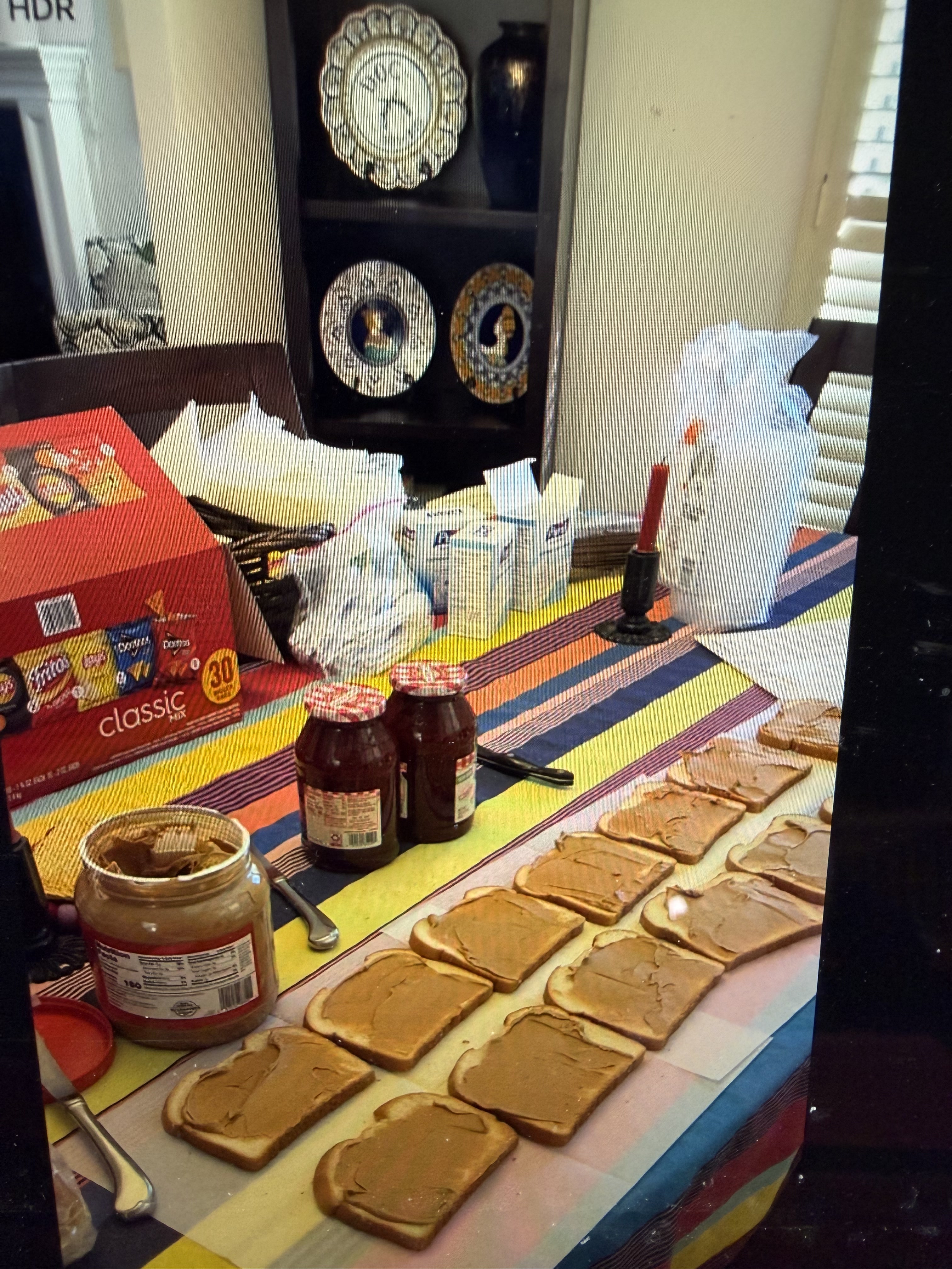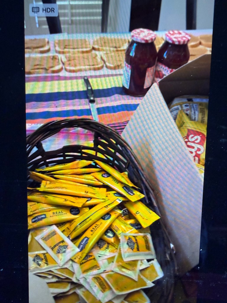 Another uneventful night and I didn’t go to the food bank the next day, but lounged in the apartment and worked on cleaning off my desk, etc. while my HG hung out in the living room. At dinner time, my neighbor called to see if she could pick up something for us for dinner from Sharky’s. That was perfect and I shared the menu with HG and we put in our order
